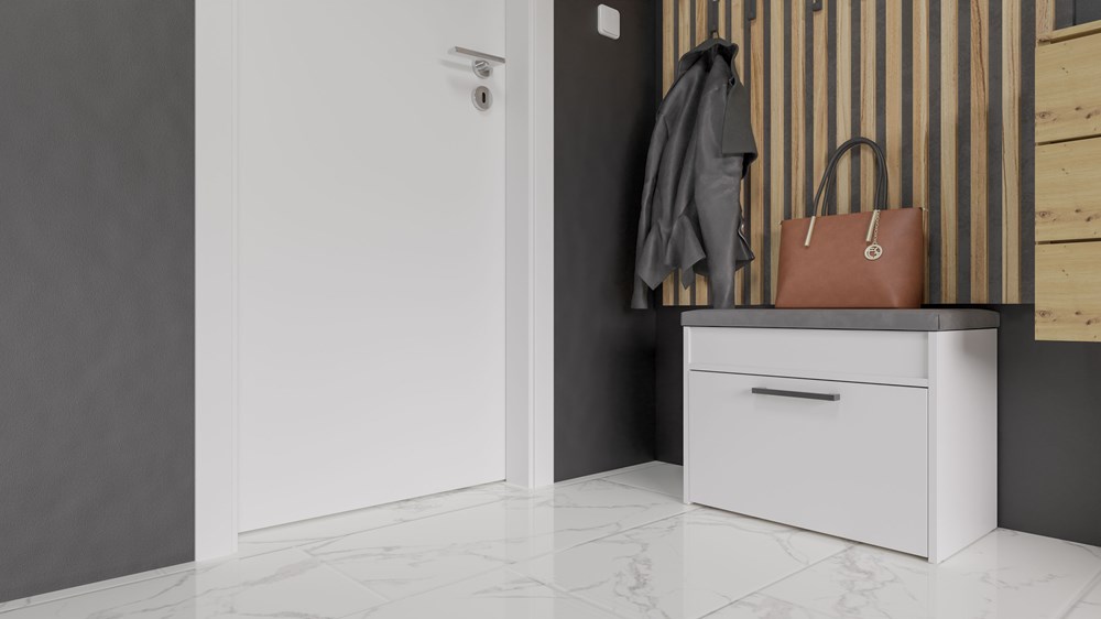 Pohodlný botník s čalouněným sedákem a praktickým úložným prostorem na drobnosti. Skříňka má výklopná dvířka, za nimiž se nachází police. Pečlivé zpracování, elegantní vzhled a originální barevné provedení zajišťují, že se hodí do každé předsíně.