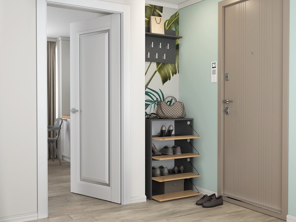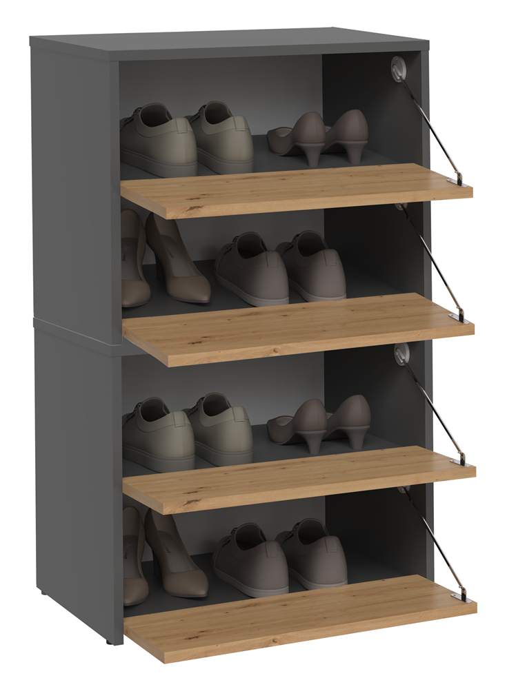 Náš botník je vyroben z laminované desky o tloušťce 16 mm, která je odolná proti oděru. Výklopná dvířka zajišťují praktické a pohodlné používání a za nimi se nachází čtyři prostorné police na obuv.