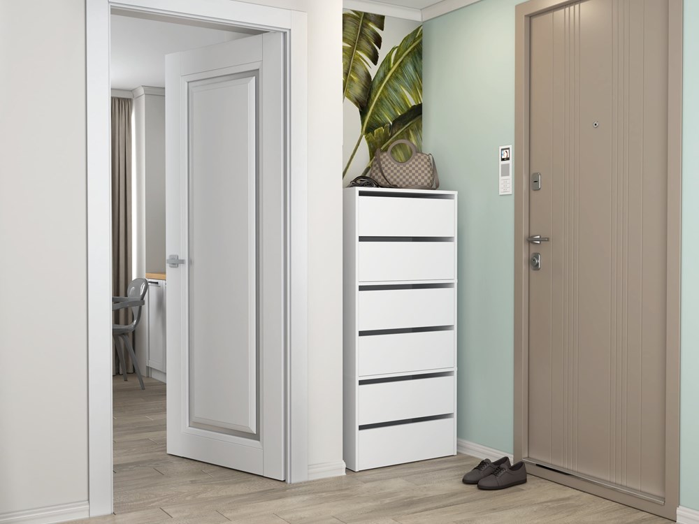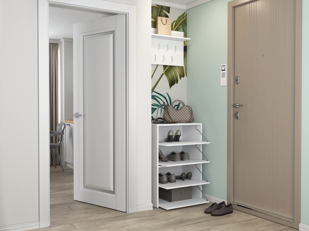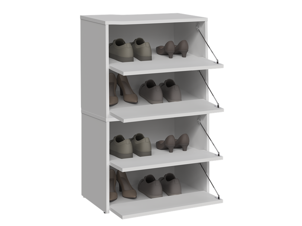 Náš botník je vyroben z laminované desky o tloušťce 16 mm, která je odolná proti oděru. Výklopná dvířka zajišťují praktické a pohodlné používání a za nimi se nachází čtyři prostorné police na obuv.