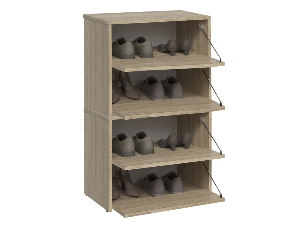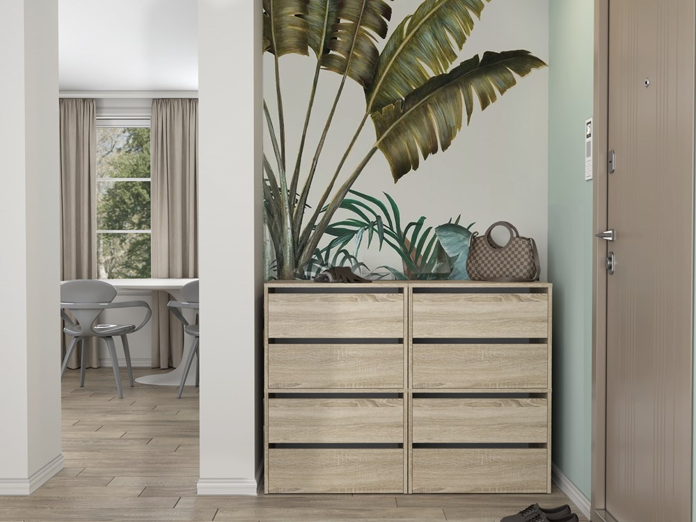 Náš botník je vyroben z laminované desky o tloušťce 16 mm, která je odolná proti oděru. Výklopná dvířka zajišťují praktické a pohodlné používání a za nimi se nachází čtyři prostorné police na obuv.