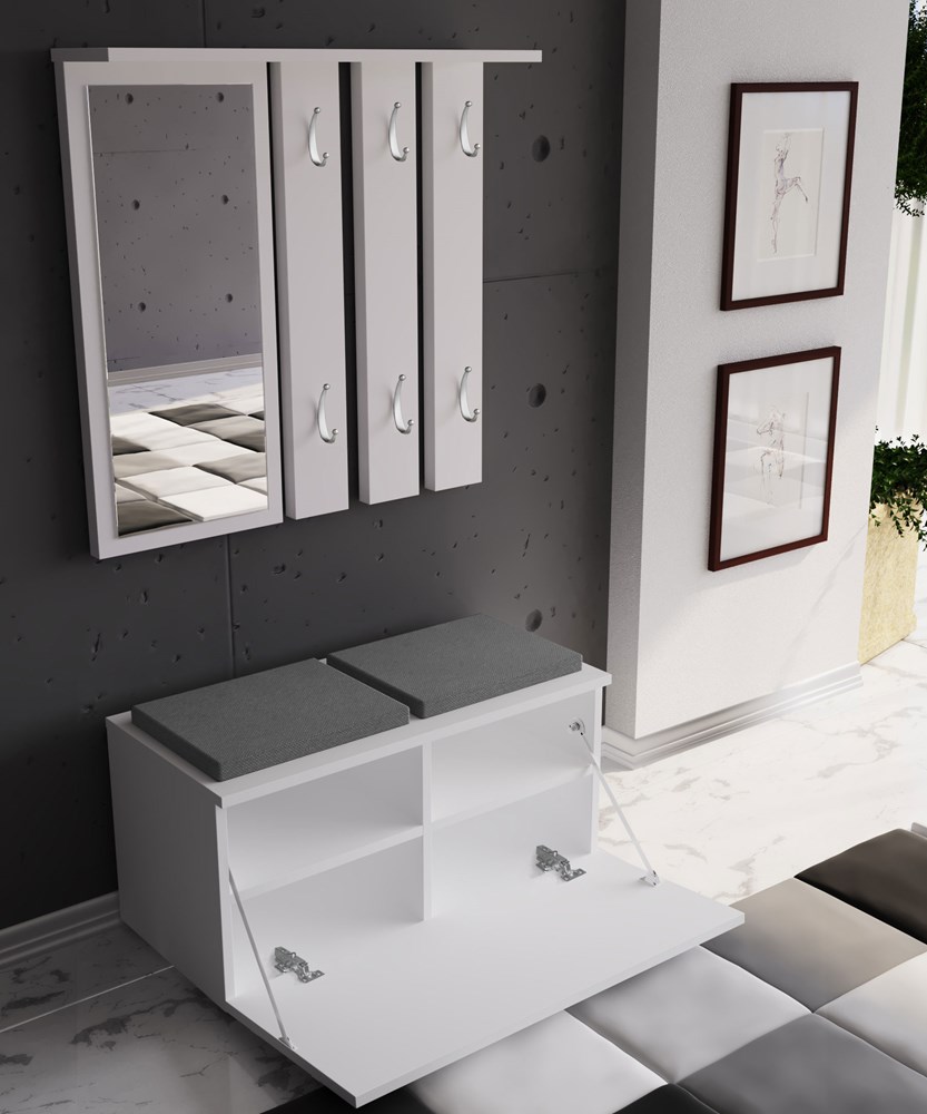 Náš botník je vyroben z laminované desky o tloušťce 16 mm, která je odolná proti oděru. Skříňka nabízí pohodlné sezení při obouvání a úložný prostor, výklopná dvířka zajišťují snadný přístup a přehledné uspořádání obuvi. Uvnitř se nacházejí 4 police. Výrobek pochází od polského výrobce.