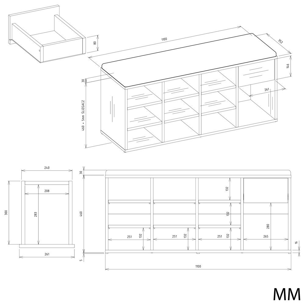 Nábytek kombinuje pohodlí sezení s funkčním úložným prostorem – obsahuje až 9 přihrádek na boty, praktickou zásuvku na drobnosti a vysokou boční komoru ideální např. na kozačky, deštníky nebo tašky. Navrchu je čalouněný, měkký sedák v šedé barvě, který zajišťuje pohodlí při obouvání.