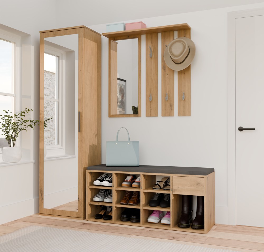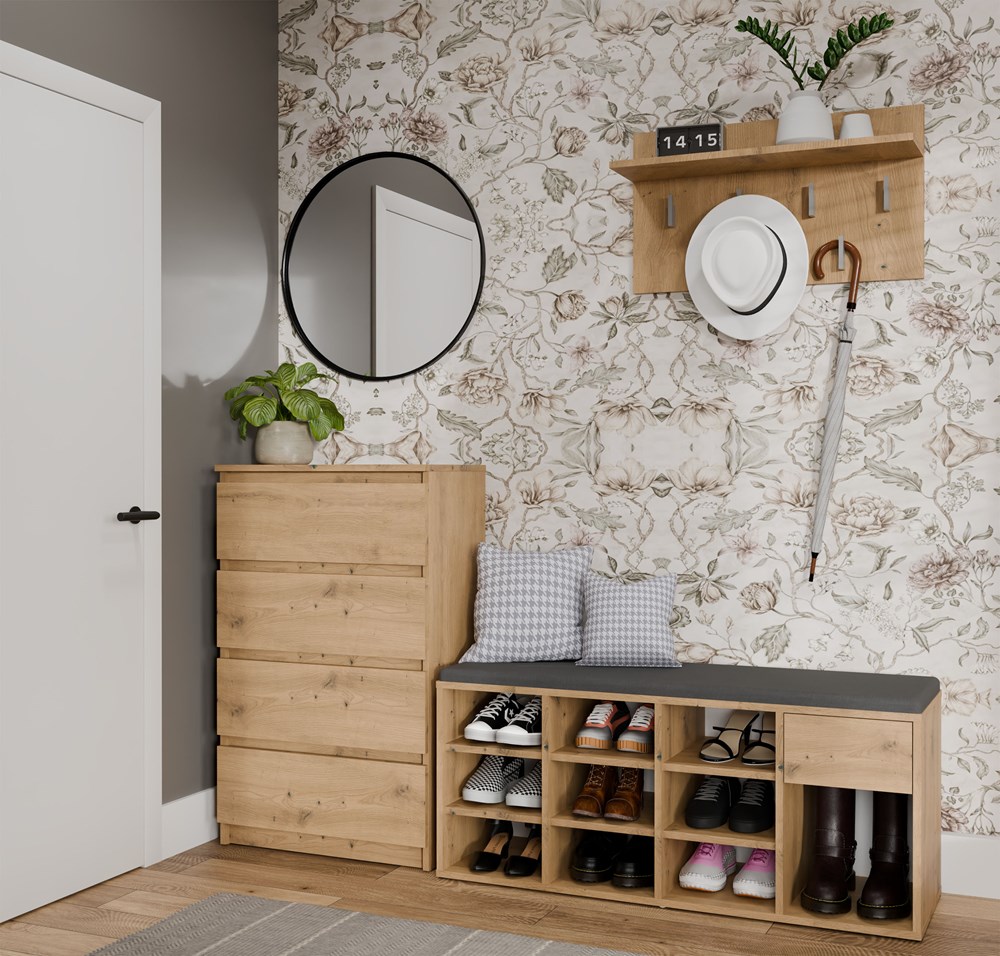 Nábytek kombinuje pohodlí sezení s funkčním úložným prostorem – obsahuje až 9 přihrádek na boty, praktickou zásuvku na drobnosti a vysokou boční komoru ideální např. na kozačky, deštníky nebo tašky. Navrchu je čalouněný, měkký sedák v šedé barvě, který zajišťuje pohodlí při obouvání.