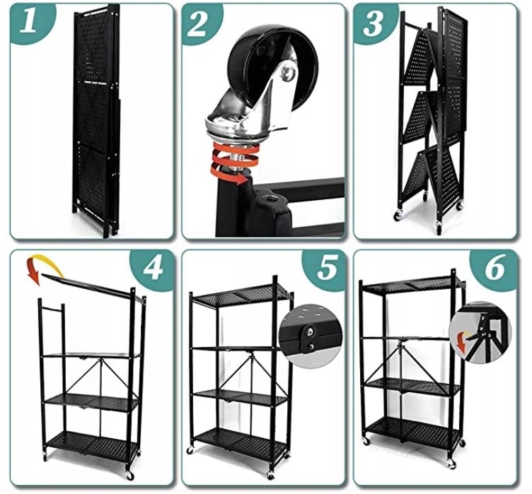 Regál je vybaven čtyřmi kolečky, z nichž dvě mají speciální brzdu proti samovolnému pohybu. Stylové provedení s otvory v policích, otevíratelná horní část a boční mřížky zabraňující vypadnutí uložených předmětů zajišťují praktické a bezpečné používání. Po složení má regál kompaktní rozměry a jeho sestavení nevyžaduje žádné nářadí. Otočná kolečka s brzdou podtrhují loftový charakter regálu.