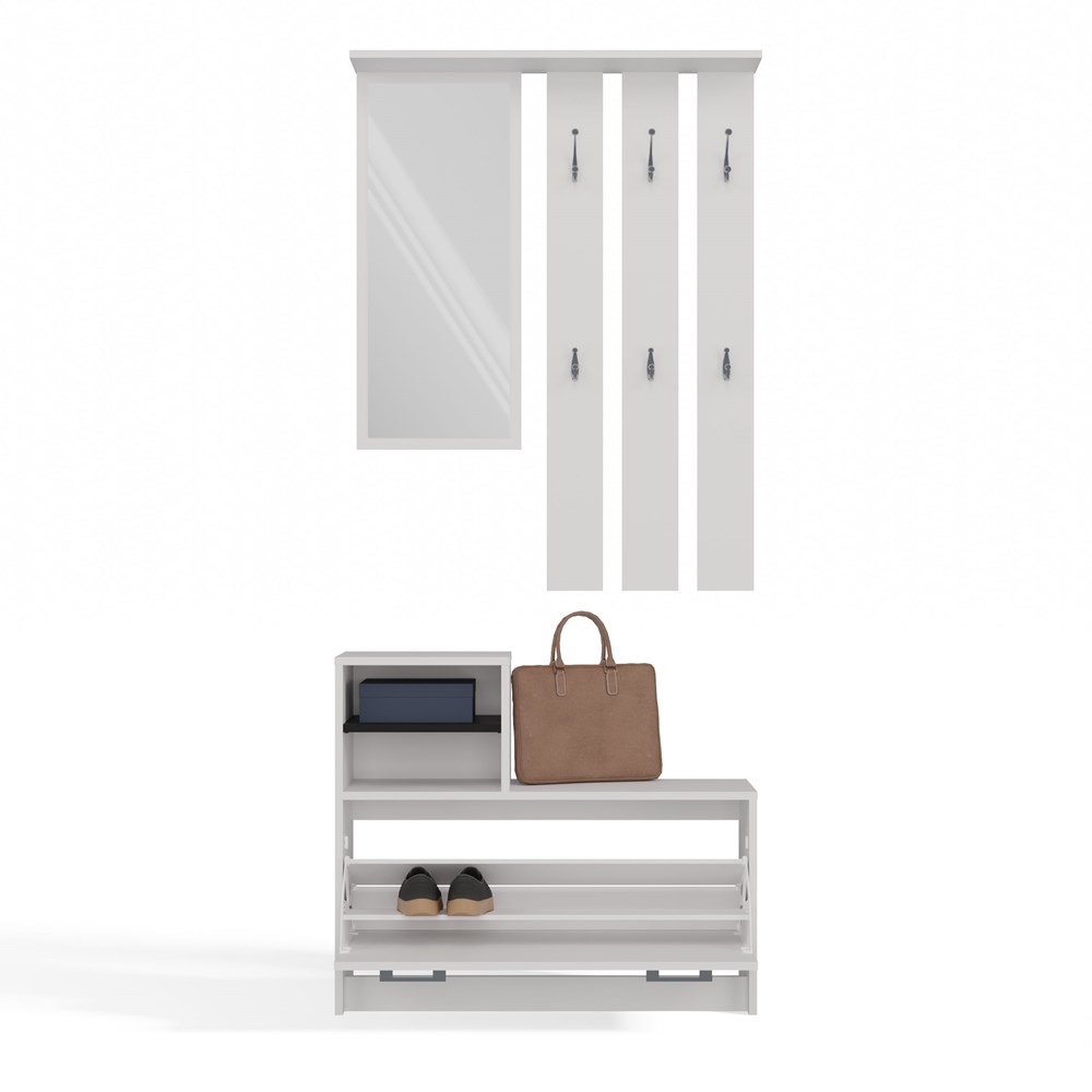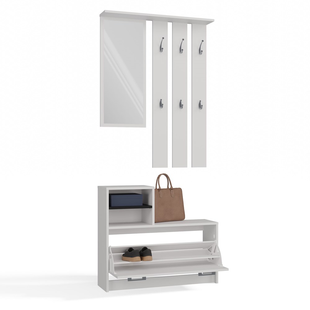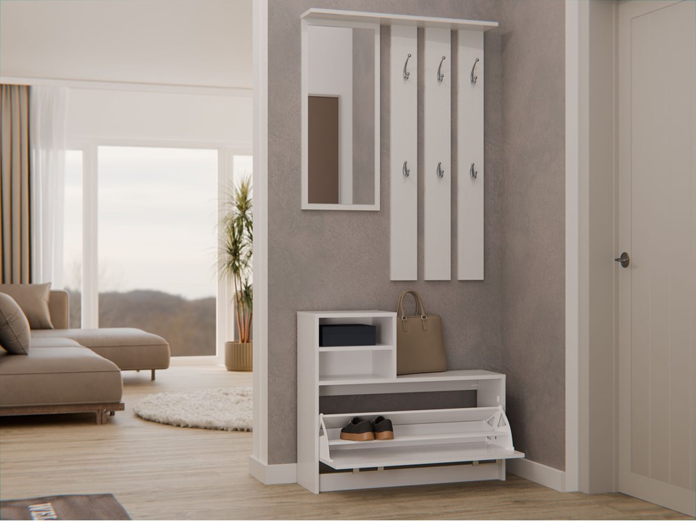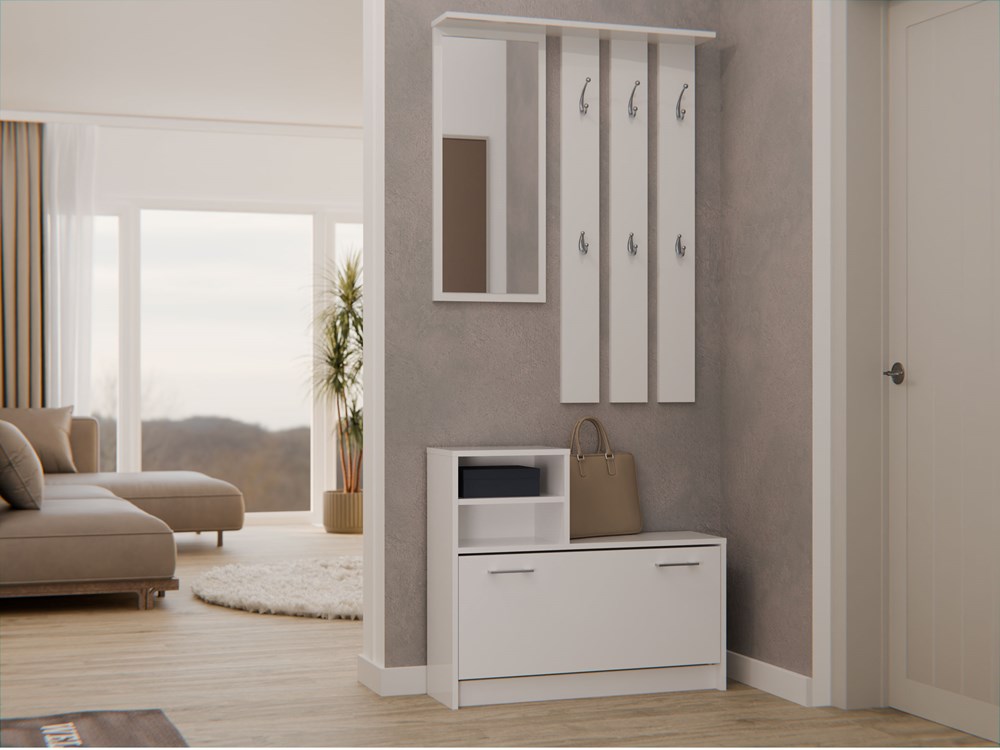 Praktická předsíňová sestava kombinuje věšák se zrcadlem a botník, díky čemuž je předsíň funkční a pohodlná. Je vybavena šesti věšáky na oděvy, praktickou policí, velkým zrcadlem a horní skříňkou. Výšku věšáku lze nastavit podle potřeby a pohodlné úchyty usnadňují otevírání botníku, který pojme 8–9 párů obuvi.