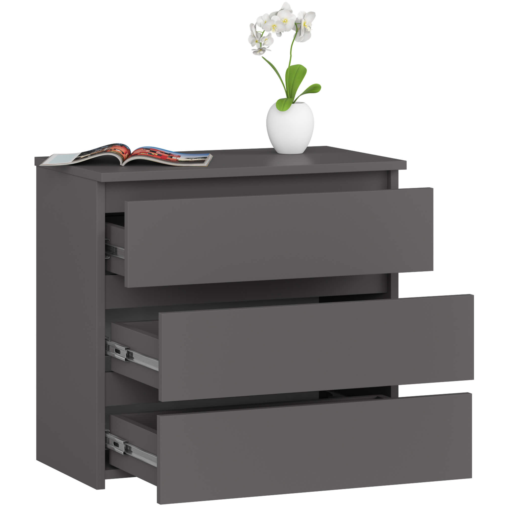 Komoda CL3 3SZ CLP grafitová šedá může sloužit jako doplňkové úložiště v obývacím pokoji, dětském nebo studentském pokoji, ale skvěle zapadne také do ložnice jako vysoký noční stolek. Tři zásuvky umožňují přehledně uložit předměty, které nechcete nechávat na očích – od dokumentů, kosmetiky a elektroniky až po kancelářské potřeby nebo drobné doplňky, které chcete mít po ruce.