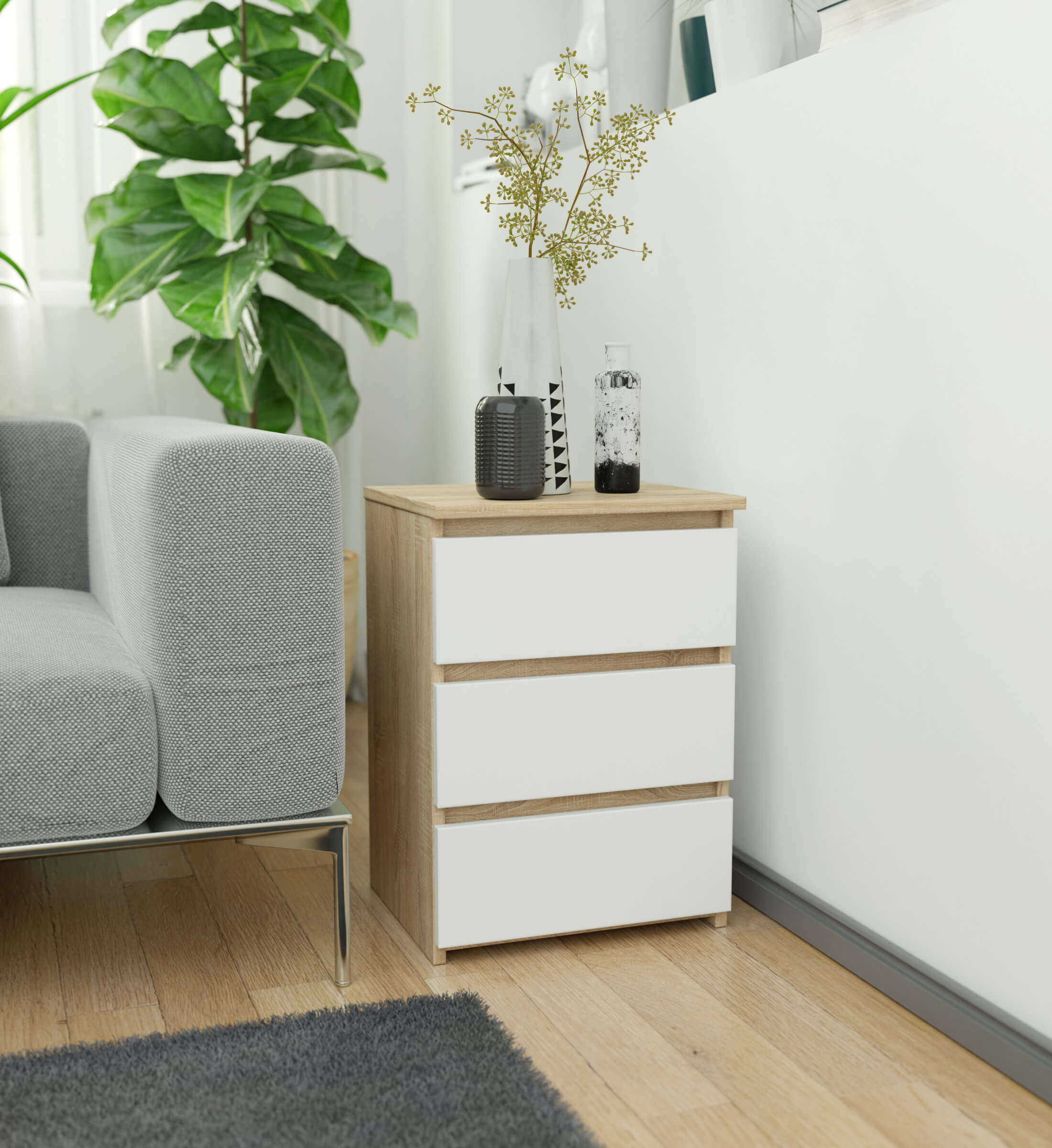 Komoda CL3 – 3 zásuvky dub sonoma/bílá může sloužit jako doplňkové úložiště v obývacím pokoji, dětském nebo studentském pokoji, ale skvěle zapadne také do ložnice jako vysoký noční stolek. Tři zásuvky umožňují přehledně uložit předměty, které nechcete nechávat na očích – od dokumentů, kosmetiky a elektroniky až po kancelářské potřeby nebo drobné doplňky, které chcete mít po ruce.