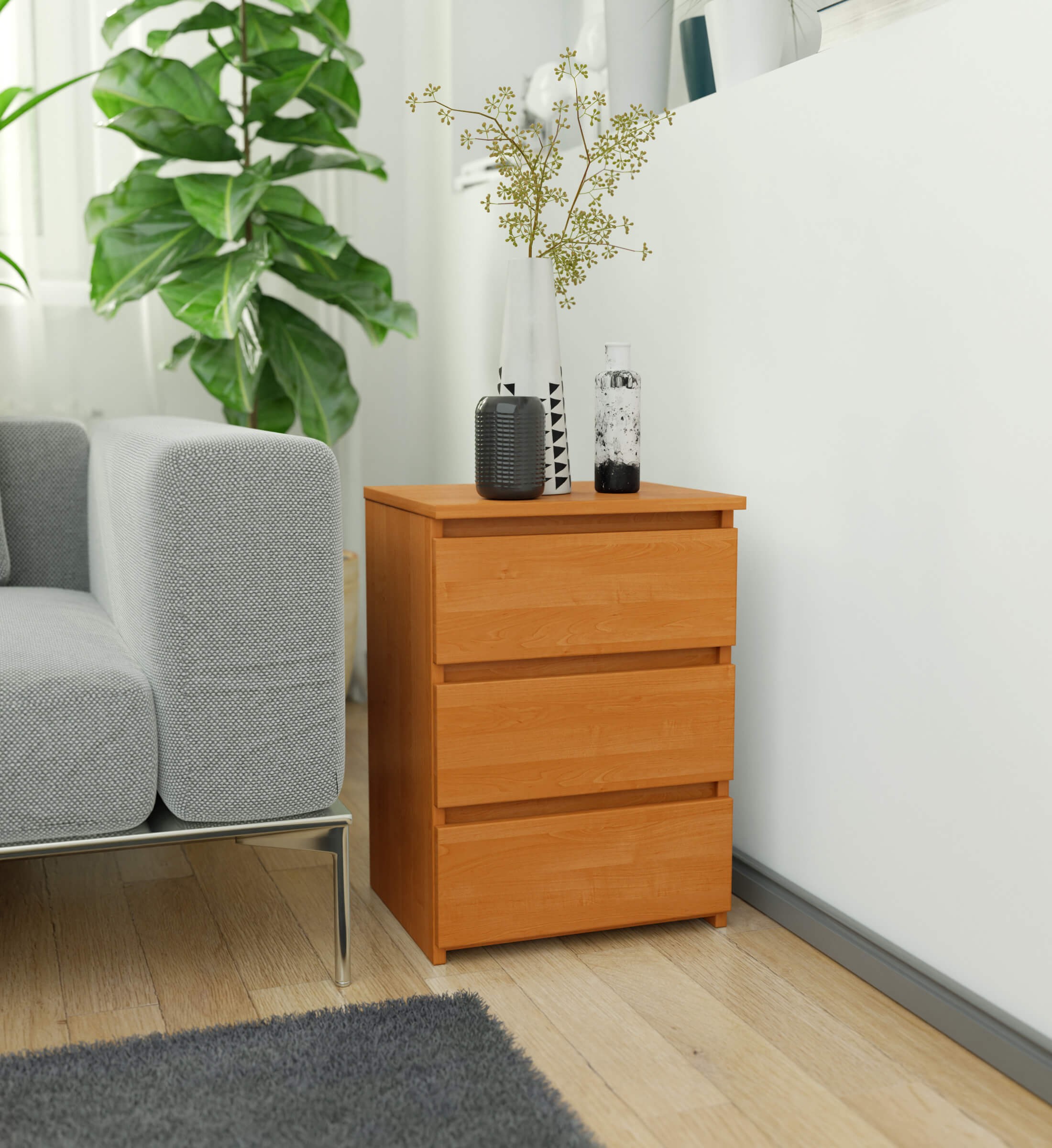 Komoda CL3 3SZ olše může sloužit jako doplňkové úložiště v obývacím pokoji, dětském nebo studentském pokoji, ale skvěle zapadne také do ložnice jako vysoký noční stolek. Tři zásuvky umožňují přehledně uložit předměty, které nechcete nechávat na očích – od dokumentů, kosmetiky a elektroniky až po kancelářské potřeby nebo drobné doplňky, které chcete mít po ruce.