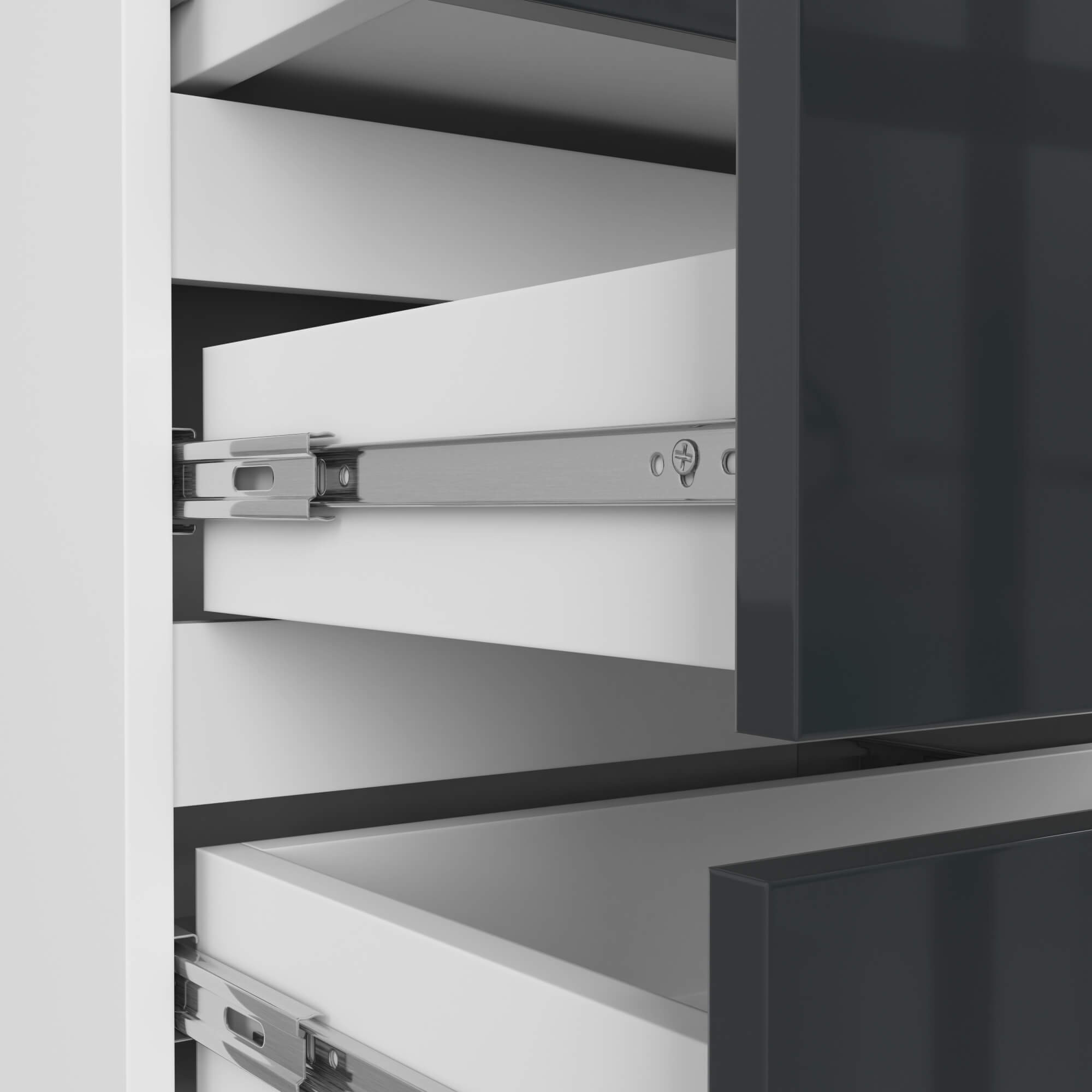 Lesklé grafitové zásuvky dodávají komodě elegantní vzhled a opticky oživují prostor. Tři praktické zásuvky poskytují dostatek místa na oblečení, dokumenty, doplňky, elektroniku i další drobnosti, které potřebujete mít po ruce. Zásuvky se vysouvají hladce a tiše díky kovovým pojezdům.