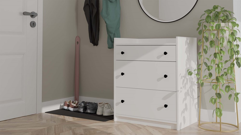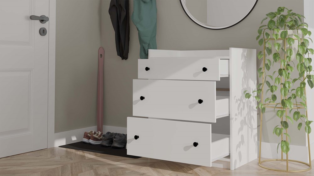 Komoda HOUSTON je univerzální nábytek, který se skvěle hodí do dětského pokoje, ložnice, obývacího pokoje i předsíně. Její minimalistický, a přitom elegantní design umožňuje sladění s různými styly – od moderních po klasické. Díky 3 prostorným zásuvkám s praktickými úchytkami poskytuje spoustu úložného prostoru pro oblečení, doplňky, textilie či dětské potřeby. Zvýšené okraje horní desky vytvářejí praktický rám, který zabraňuje sklouznutí drobností – ideální pro položení přebalovací podložky, lampičky nebo organizérů.