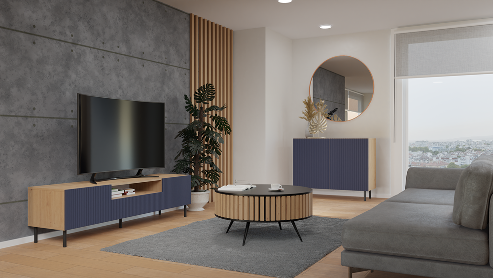 Moderní a stylová komoda KAMA je funkční a prostorný kus nábytku, který vnese nový vzhled do ložnice, obývacího pokoje nebo dětského pokoje. Jednoznačný hit a novinka – rýhovaná dvířka uspořádaná svisle, připomínající lamely. Elegance, styl a jedinečný šarm v jednom. Velkou předností jsou kulaté kovové nohy o výšce 13 cm, které dodávají konstrukci vizuální lehkost a zároveň zajišťují stabilitu komody. Vnitřní prostor je vybaven policemi, které usnadňují přehledné uspořádání věcí a rychlý přístup k nim.