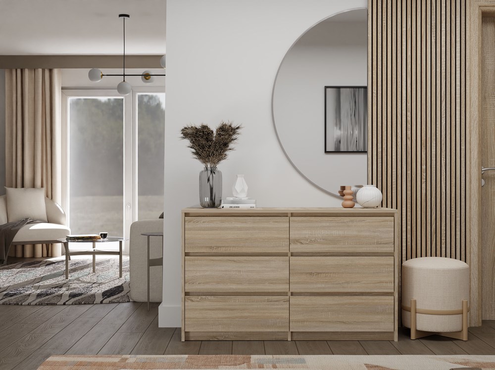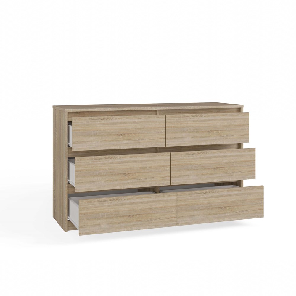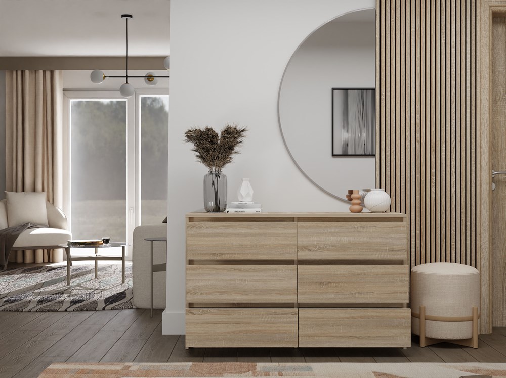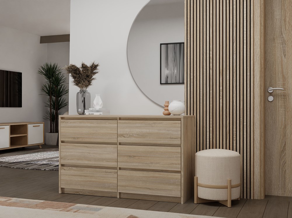 Moderní komoda z kolekce KARO je funkční a prostorný kus nábytku, který se skvěle hodí do ložnice, obývacího pokoje i dětského pokoje. Její univerzální design splní očekávání všech, kteří oceňují spojení jednoduchosti a elegance. Minimalistické provedení a bezúchytková čela zásuvek zajišťují pohodlné používání a podtrhují moderní charakter interiéru. Komoda se vyznačuje velmi dobrou kvalitou zpracování, novým typem kování a hladkými boky bez viditelných krytek.Montážní návod je součástí balení.