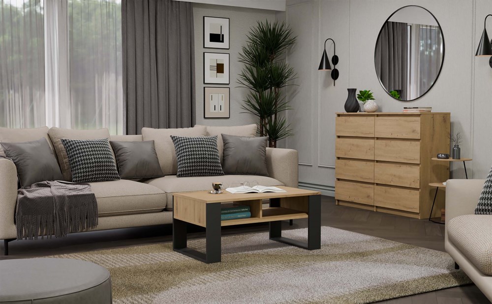 Moderní konferenční stolek Model: Modern 2P s deskou v dekoru dub artisan a nohami v odstínu antracit je praktický a elegantní kus nábytku, který lze využít také jako kávový stolek. Stolek nabízí dvě prostorné police pod horní deskou, jež poskytují dostatek úložného prostoru. Montáž je rychlá a snadná – návod a veškeré potřebné montážní příslušenství jsou součástí balení. Stolek je vyroben z dvakrát laminované desky se zvýšenou tvrdostí, což zajišťuje odolnější povrch proti poškrábání. Použití kvalitních materiálů, zajímavý tvar nohou a prostorná horní deska vytvářejí praktický a nepostradatelný kus nábytku, který se skvěle hodí do moderního obývacího pokoje.