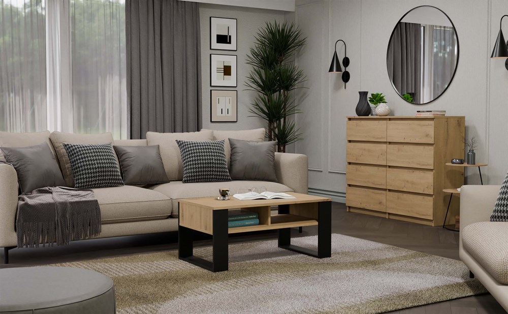 Moderní konferenční stolek Model: Modern 2P v dekoru dub artisan / černá je funkční a praktický kus nábytku, který lze skvěle využít i jako kávový stolek. Disponuje dvěma prostornými policemi pod horní deskou, které poskytují dostatek úložného prostoru. Montáž je jednoduchá a rychlá, návod k montáži a veškeré potřebné příslušenství jsou součástí balení. Stolek je vyroben z dvakrát laminované desky se zvýšenou tvrdostí, což zajišťuje odolnější povrch proti poškrábání. Použití kvalitních materiálů, zajímavý tvar nohou a prostorná horní deska vytvářejí praktický a nepostradatelný kus nábytku vhodný do moderního obývacího pokoje.