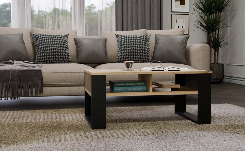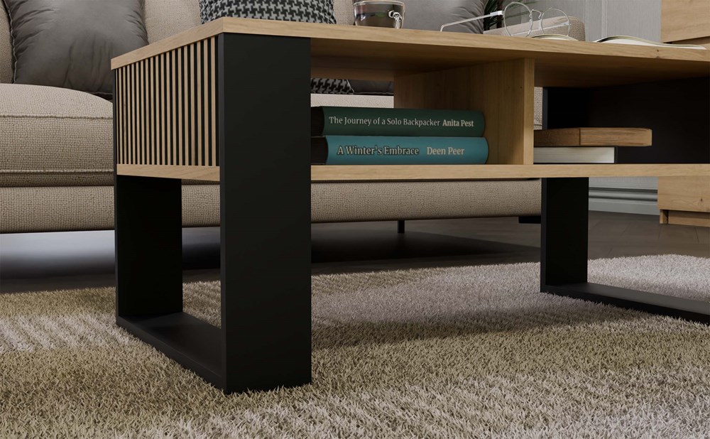 Design: Inovativní provedení s rýhovanými bočními stranami, které imitují lamely a dodávají stolku jedinečný charakter.Úložný prostor: Dvě prostorné police pod horní deskou poskytují praktické místo pro uložení věcí.Odolnost: Horní deska i nohy jsou vyrobeny z laminované dřevotřískové desky se zvýšenou tvrdostí, což zvyšuje odolnost proti poškrábání.Snadná montáž: Rychlá a jednoduchá montáž díky přiloženému návodu a montážnímu příslušenství. Stolek se skvěle hodí do obývacího pokoje. Je vyroben z dvakrát laminované desky se zvýšenou tvrdostí, která zajišťuje vyšší odolnost povrchu proti poškrábání. Použití kvalitních materiálů, zajímavý tvar nohou a prostorná horní deska vytvářejí praktický a nepostradatelný kus nábytku.