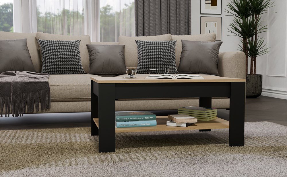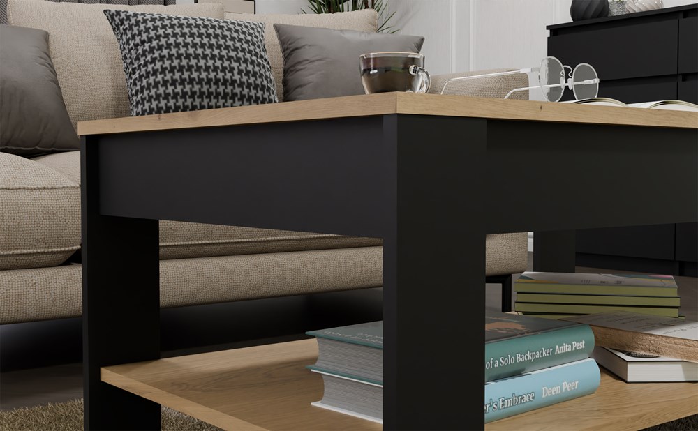 Díky promyšlené konstrukci nabízí stolek pohodlné místo na odložení nápoje, knihy či notebooku, zatímco spodní police je ideální pro časopisy, ovladače nebo jiné drobnosti.