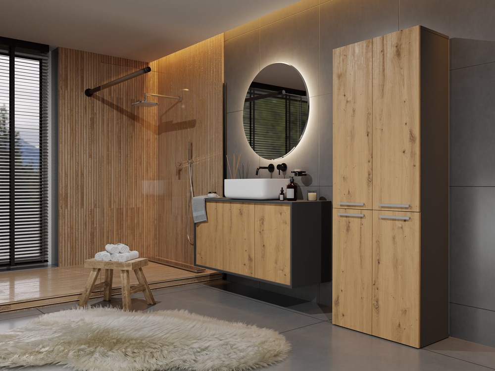 V každé koupelně se najdou věci, které potřebují své místo. Díky praktickým sloupkovým skříňkám snadno udržíte pořádek, aniž by zabíraly příliš mnoho prostoru. Nadčasový design uspokojí všechny, kdo ocení kombinaci jednoduchosti a elegance. Minimalistické úchytky zajišťují pohodlný přístup k obsahu skříňky a precizní provedení podtrhuje kvalitu nábytku. Skříňka nabízí 3 praktické police a 3 koše. K dispozici jsou také varianty s otevřenými policemi a jedním košem.