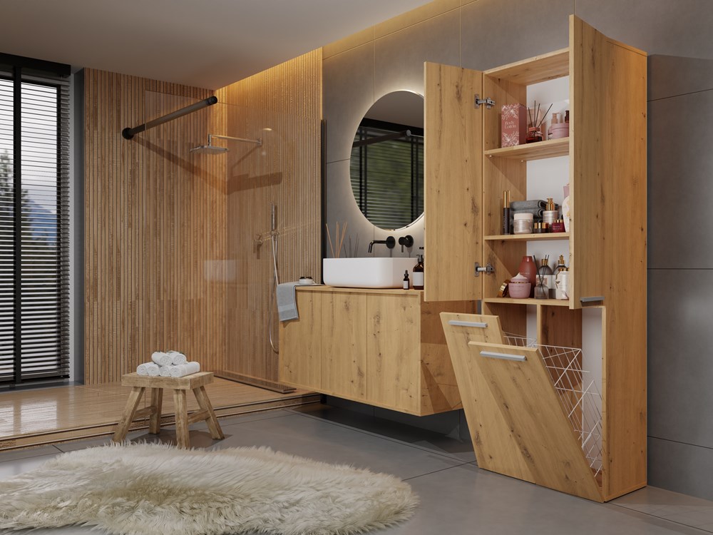 V každé koupelně se najdou předměty, které potřebují své místo. Praktické sloupkové skříňky umožňují snadno udržet pořádek, aniž by zabíraly příliš mnoho prostoru. Nadčasový design potěší všechny, kdo ocení spojení jednoduchosti a elegance. Minimalistické úchytky zajišťují pohodlný přístup k obsahu skříňky a precizní provedení podtrhuje kvalitu nábytku. Skříňka nabízí 3 praktické police a 3 koše. K dispozici jsou také varianty s otevřenými policemi a jedním košem.