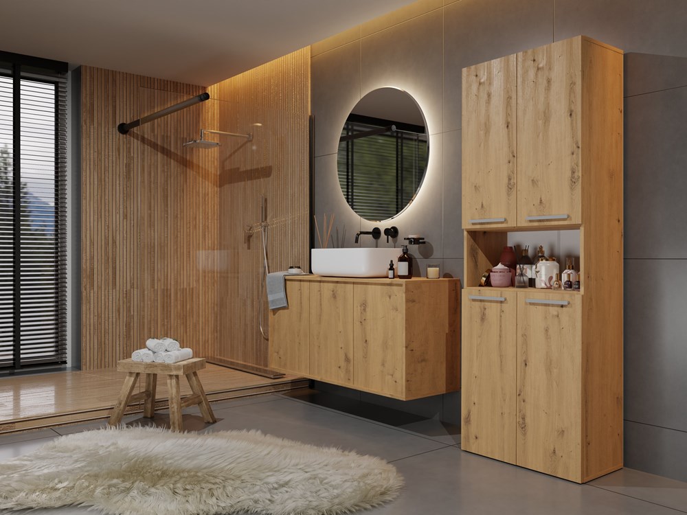 V každé koupelně se najdou věci, které potřebují své místo. Praktické sloupkové skříňky umožňují udržet pořádek, aniž by zabíraly příliš mnoho prostoru. Univerzální design osloví všechny, kteří ocení kombinaci jednoduchosti a elegance. Minimalistické úchytky umožňují pohodlný přístup k obsahu skříňky. Pečlivé a kvalitní zpracování. Skříňka disponuje 3 praktickými policemi a 2 koši. V nabídce jsou také varianty se zcela uzavřenými policemi a jedním košem.