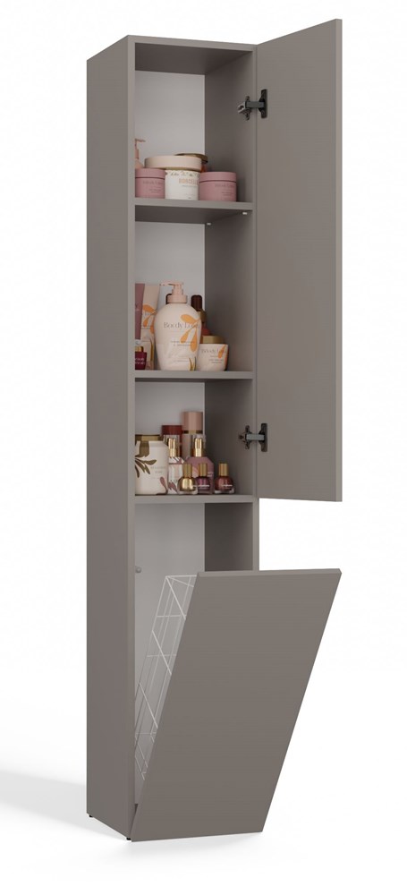 V každé koupelně je potřeba mít vše přehledně uspořádané. Praktický sloupek umožňuje udržet pořádek, aniž by zabíral příliš mnoho místa.Exkluzivní a elegantní šedý odstín dodává nábytku sofistikovaný vzhled.Jeho univerzální design uspokojí všechny, kdo ocení kombinaci jednoduchosti a elegance.Minimalistické úchytky zajišťují pohodlný přístup k obsahu skříňky.Pečlivé a kvalitní zpracování zaručuje dlouhou životnost.Systém TIP-ON u dveří umožňuje jejich otevření po jemném stlačení čelní plochy díky mechanickému asistovanému otevírání.Směr otevírání dveří lze nastavit přímo při montáži – vlevo nebo vpravo.Skříňku lze kombinovat s dalšími produkty ze série NEL a vytvořit tak dokonalou koupelnovou sestavu.