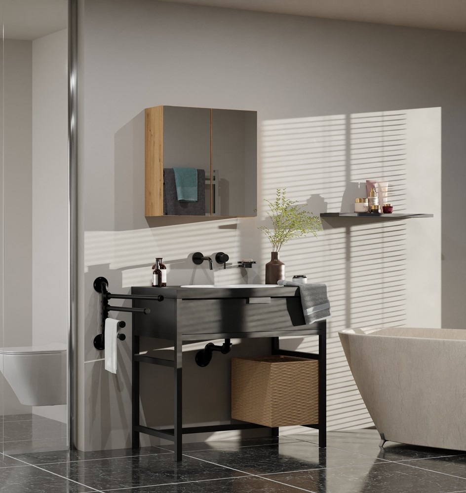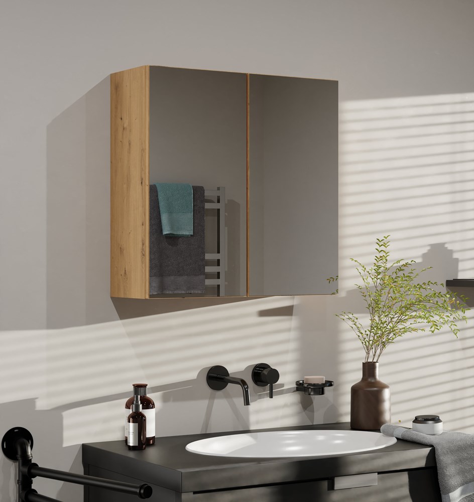 Ideální pro malé i středně velké koupelny – efektivně využívá prostor nad umyvadlem.Skříňka je vybavena třemi praktickými policemi ukrytými za stylovými dvířky se zrcadlovým čelem.Elegantní a moderní vzhled s hladkými bočnicemi a moderním kováním.Minimalistická konstrukce.Závěsná koupelnová skříňka nad umyvadlo představuje ideální řešení pro menší prostory a pomáhá maximálně využít místo ve vaší koupelně. Nabízí dostatek úložného prostoru pro ručníky, kosmetiku, čisticí prostředky i další koupelnové doplňky.