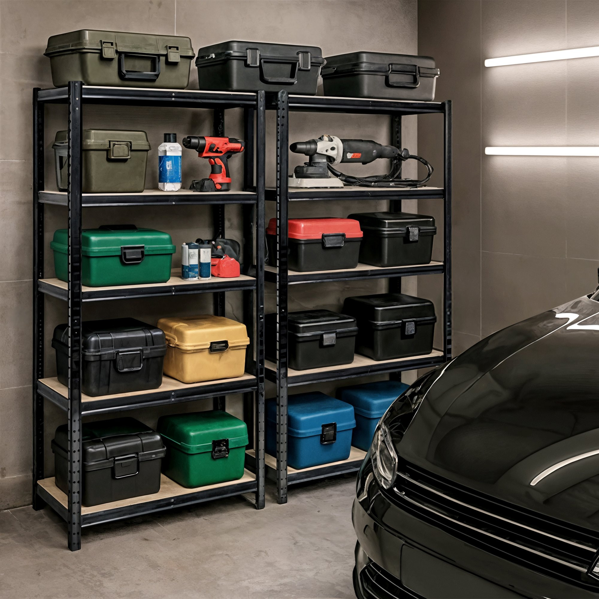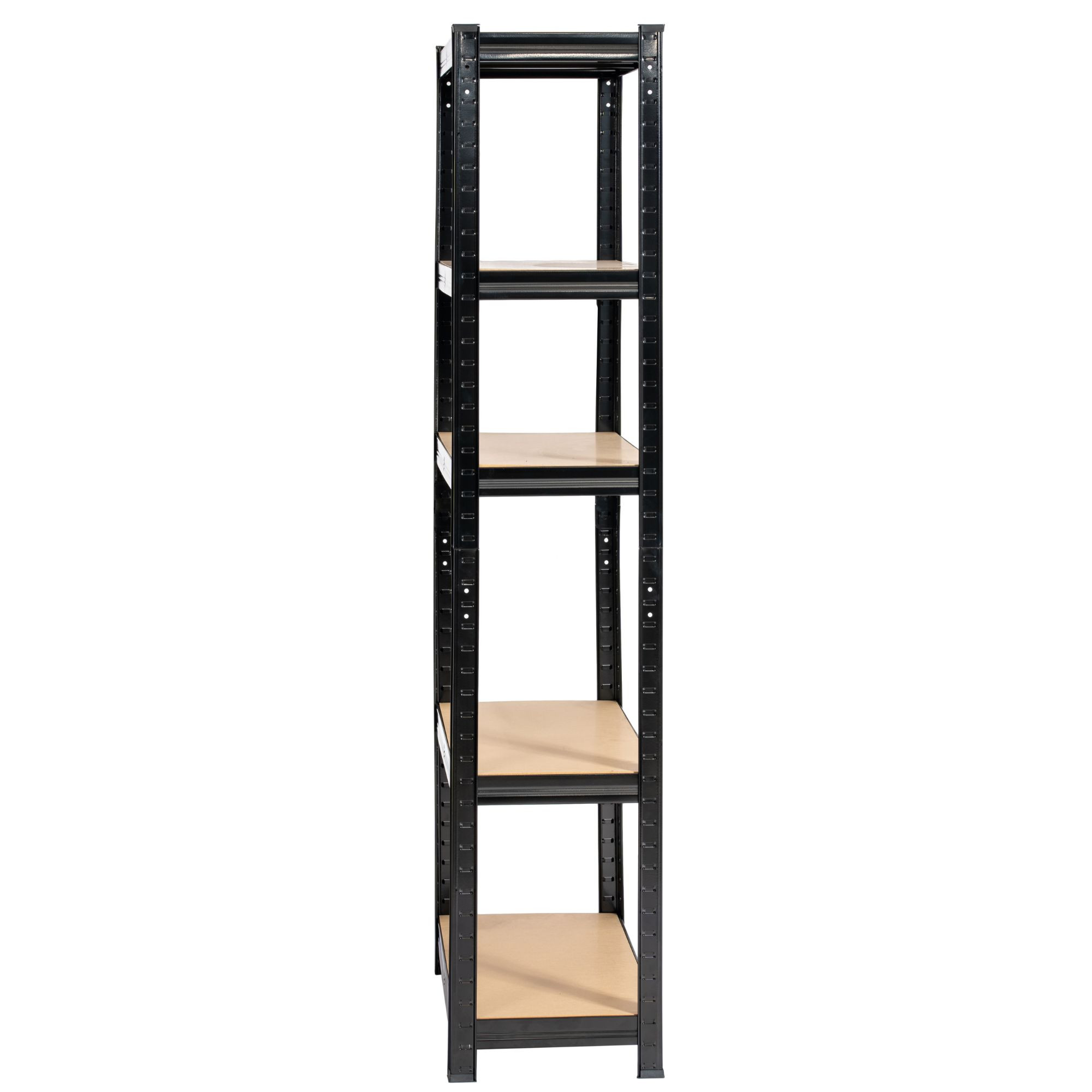 Regál je postaven na pevné ocelové konstrukci, která zajišťuje vysokou stabilitu a dlouhou životnost. Police jsou vyrobeny z odolné MDF desky a každá z nich má nosnost až 175 kg, což umožňuje bezpečné uložení nářadí, techniky i dalších těžších předmětů. Černý povrch konstrukce dodává regálu moderní vzhled a zároveň zvyšuje jeho odolnost při každodenním používání.