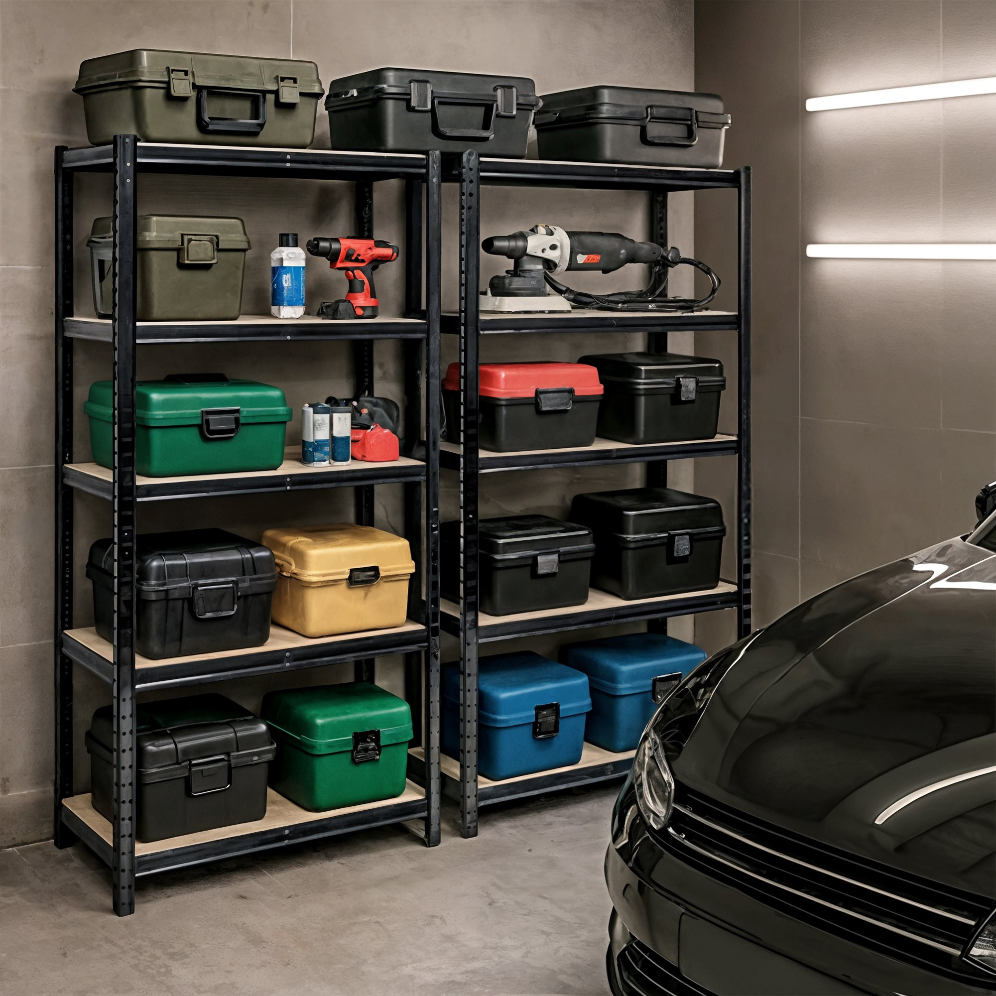 Kovový regál s 5 policemi je praktickým a univerzálním řešením pro přehledné skladování v garáži, dílně, sklepě, technické místnosti nebo komoře. Díky pevné ocelové konstrukci a vysoké nosnosti jednotlivých polic se skvěle hodí pro uložení nářadí, pracovního vybavení, boxů, náhradních dílů i dalších těžších předmětů.