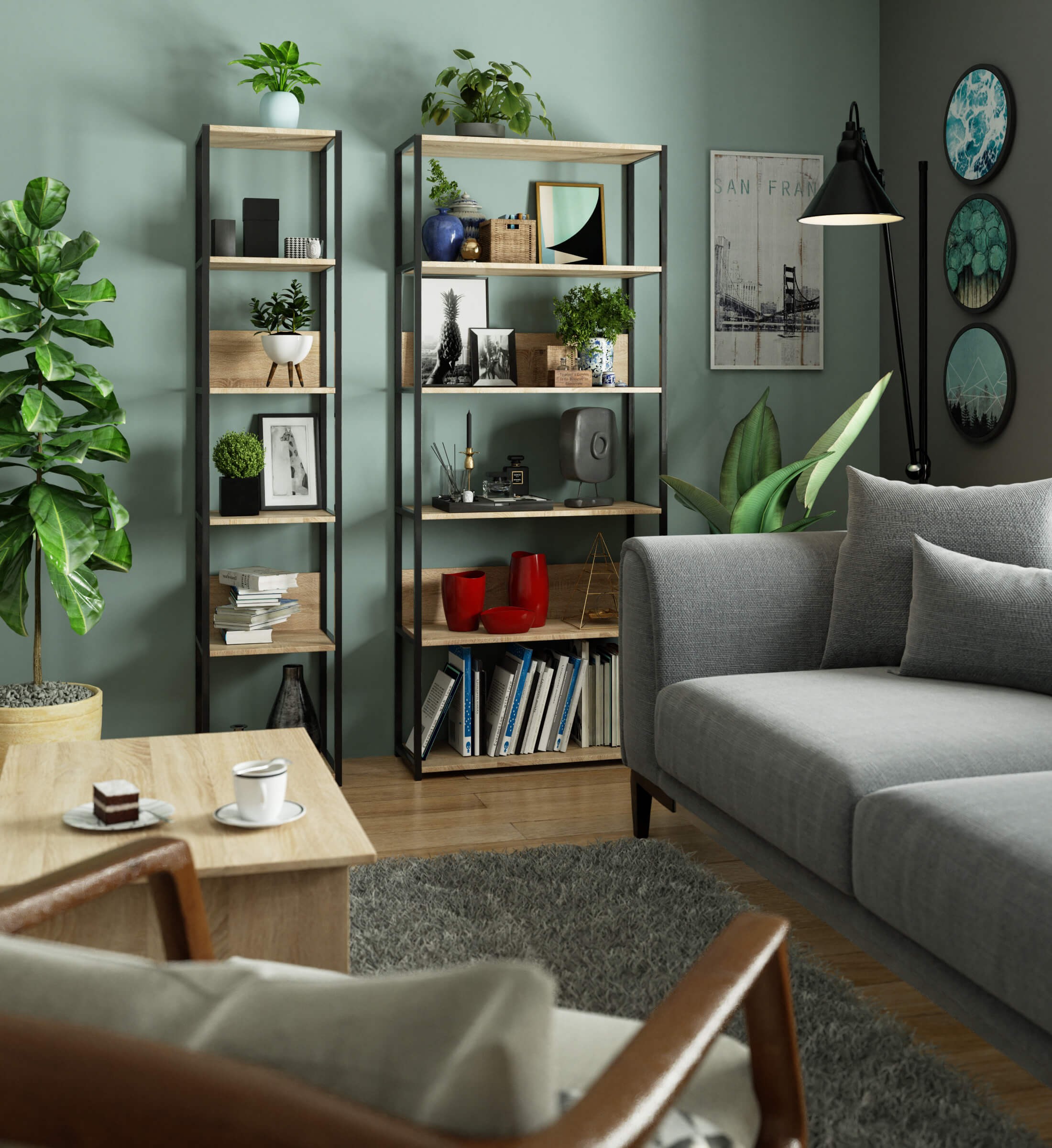 Loftový kovový regál se 6 policemi je praktický a moderní kus nábytku vhodný do obývacího pokoje, kanceláře nebo pracovny. Černý kovový rošt v kombinaci s policemi v dekoru dub sonoma vytváří nadčasový loftový vzhled.