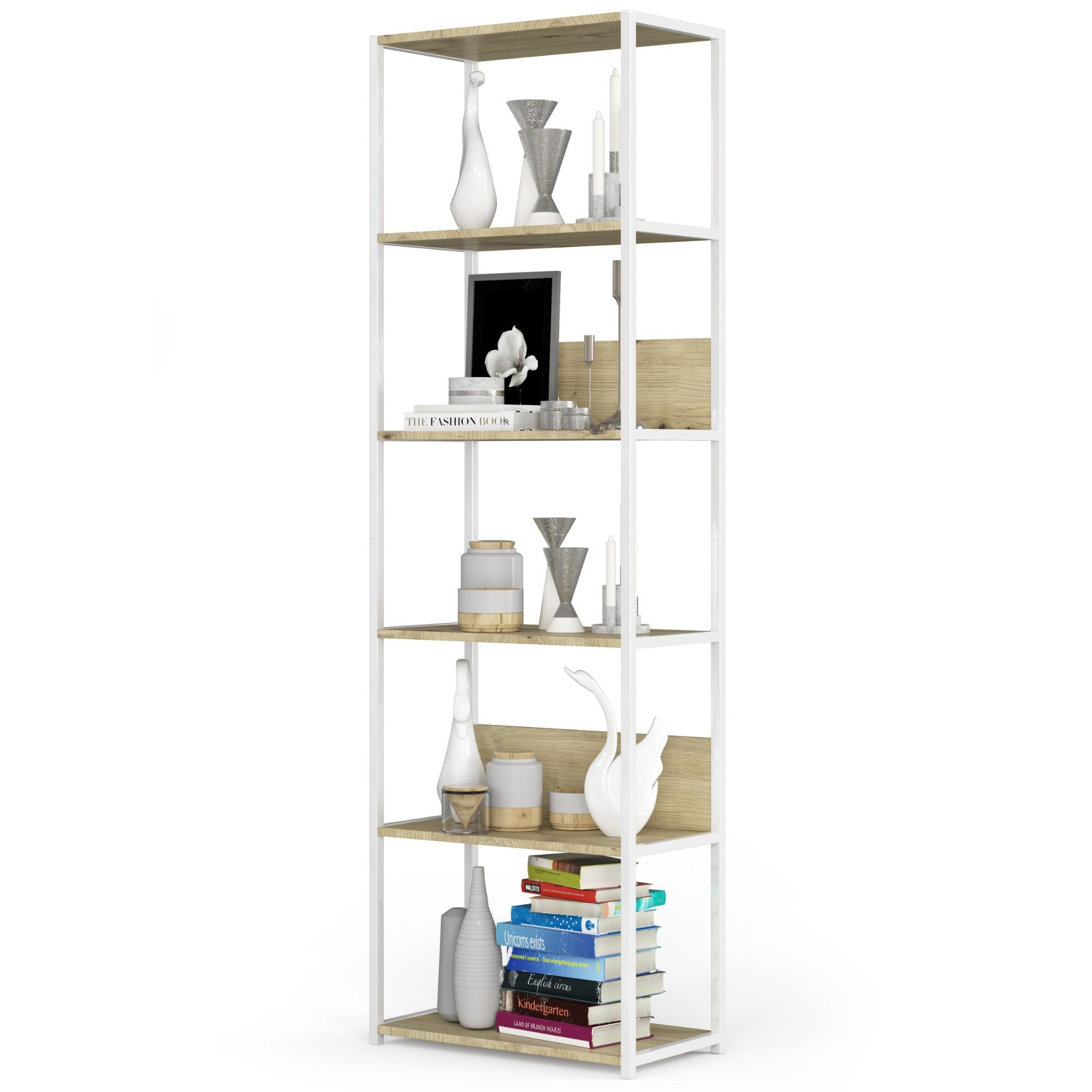 Loftový kovový regál se 6 policemi je praktický a moderní kus nábytku vhodný do obývacího pokoje, kanceláře nebo pracovny. Bílý kovový rošt v kombinaci s policemi v dekoru dub artisan vytváří elegantní a nadčasový loftový vzhled.