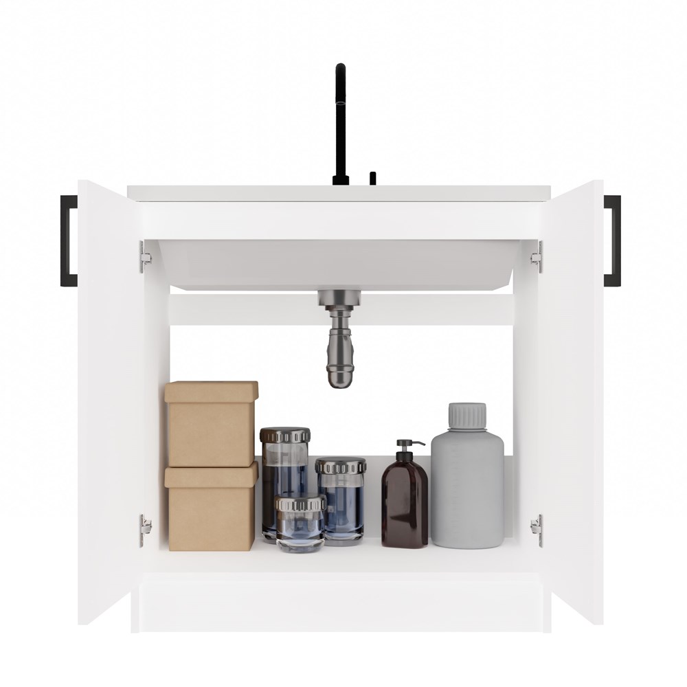 Skříňka se vyznačuje moderním a univerzálním barevným provedením v matné bílé barvě. Disponuje dvěma funkčními dvířky s pevnými panty a lze ji použít jako spodní skříňku pod pracovní desku (pracovní deska není součástí balení) nebo jako základ pro dřez. Odolné úchyty v černé barvě dodávají nábytku výrazný kontrast. Díky svým rozměrům je ideální volbou do menších kuchyní, kuchyňských koutů či garsoniér. Jedná se o výrobek polského výrobce