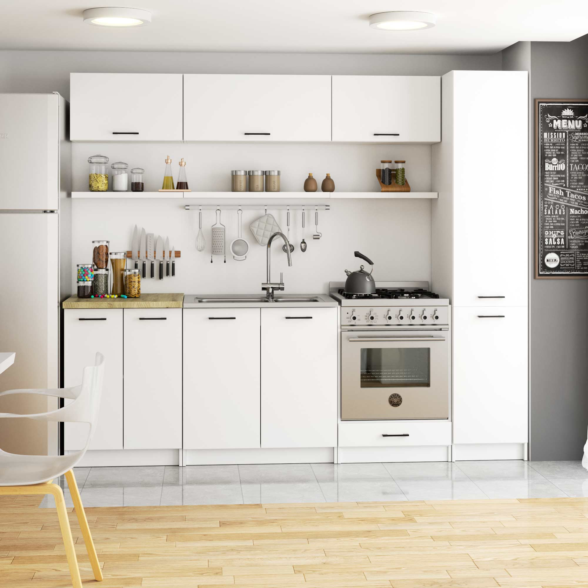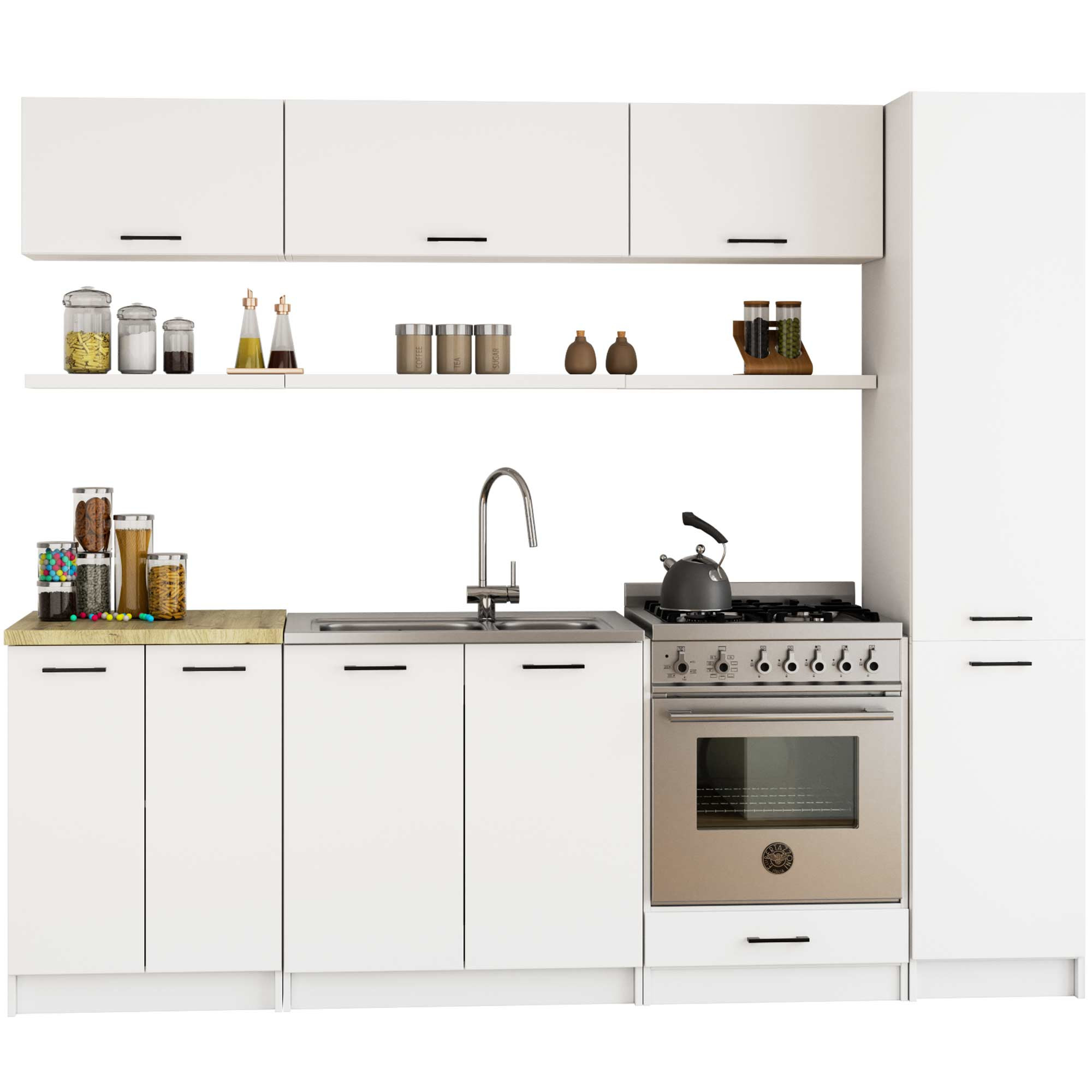 Kuchyňský regál je zajímavým řešením kuchyňské sestavy, které dokáže na malé ploše pojmout mnoho nezbytných kuchyňských potřeb. Nádobí, čisticí prostředky, potraviny – to jsou jen některé z položek, které najdou své místo na policích uvnitř prezentovaného kuchyňského sloupku. Moderní nábytek je vyroben v bílé barvě. Tmavé úchytky skvěle ladí s touto barevnou kombinací a vytvářejí jednotný celek.
