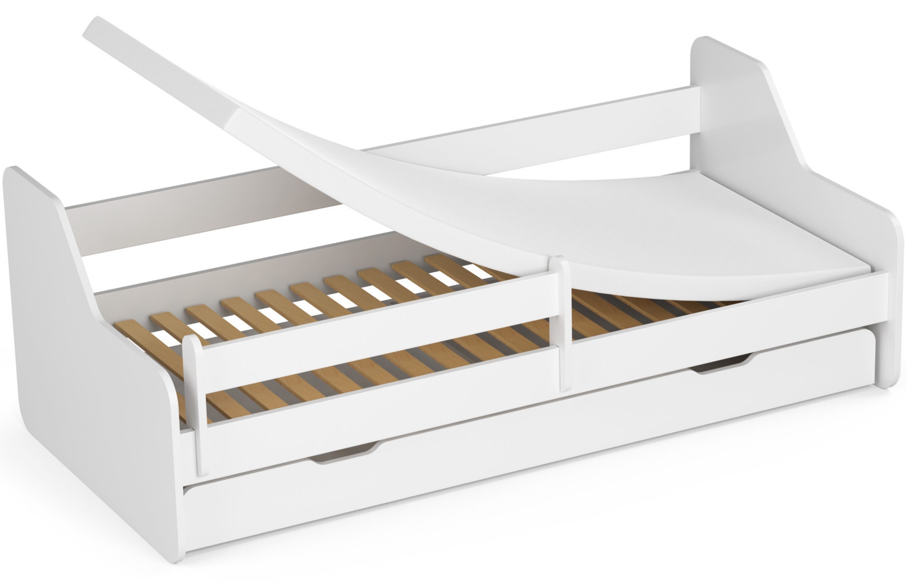Postel je dodávána jako kompletní sestava včetně matrace, pevného roštu, prostorné zásuvky a boční ochranné zábrany. Zásuvka pod lůžkem poskytuje praktický úložný prostor na lůžkoviny, hračky nebo oblečení. Ochranná zábrana zvyšuje bezpečnost dítěte během spánku.