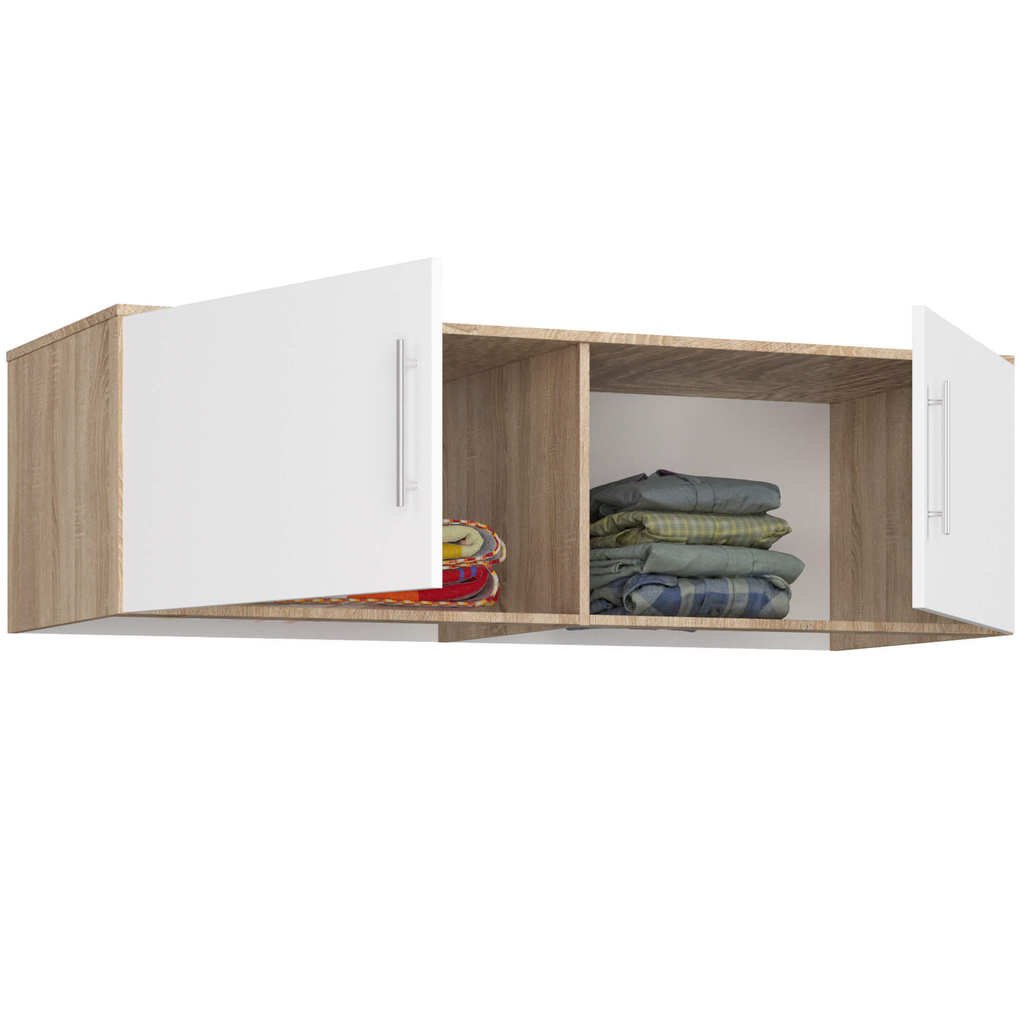 Nástavba na skříň S150 v kombinaci dekoru dub sonoma a bílé barvy je ideálním řešením pro rozšíření úložného prostoru bez nutnosti zabírat více místa v interiéru. Elegantní dvoubarevné provedení působí svěže a snadno se kombinuje s moderními i klasickými šatními skříněmi.