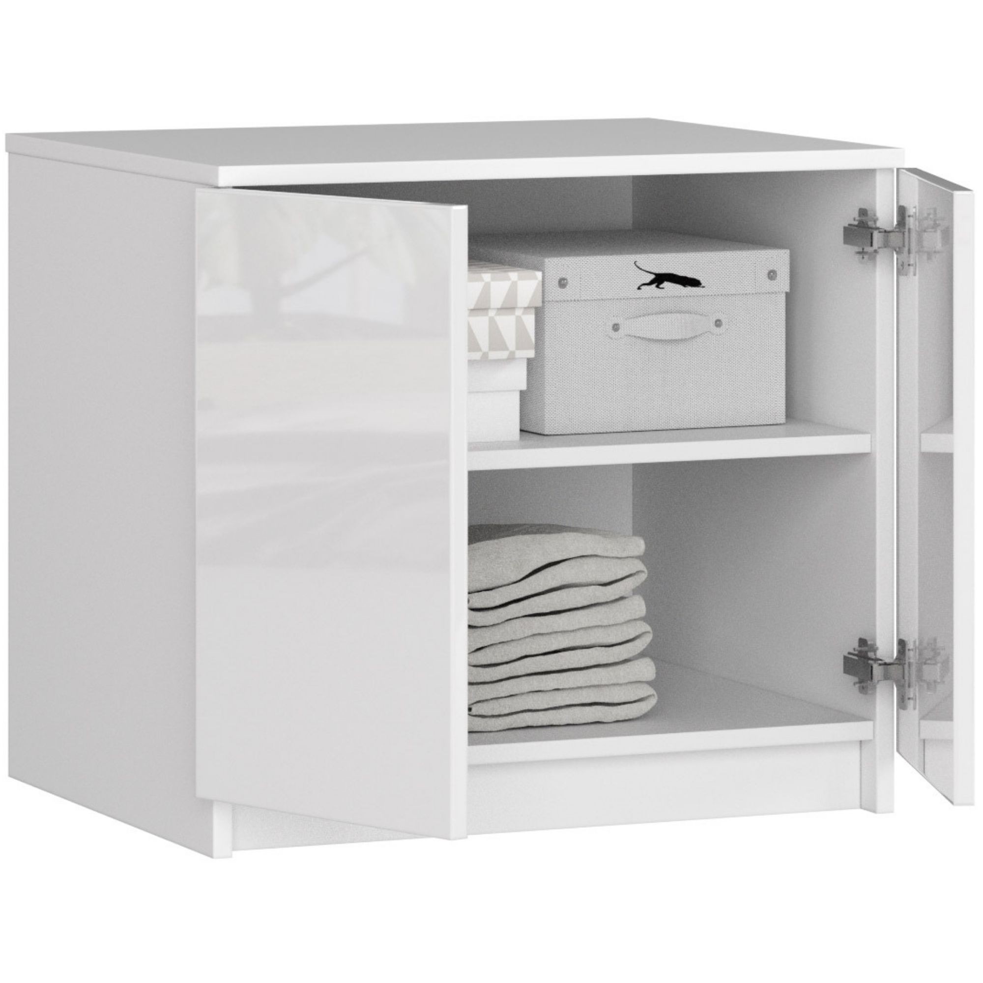 Kombinace čistě bílé barvy s moderním vysokým leskem působí svěže a elegantně a snadno zapadne do jakéhokoli stylu interiéru – minimalistického, skandinávského, moderního i klasického. Za dvířky se nacházejí dvě prostorné police, které nabídnou pořádek a přehledné uspořádání uložených věcí.