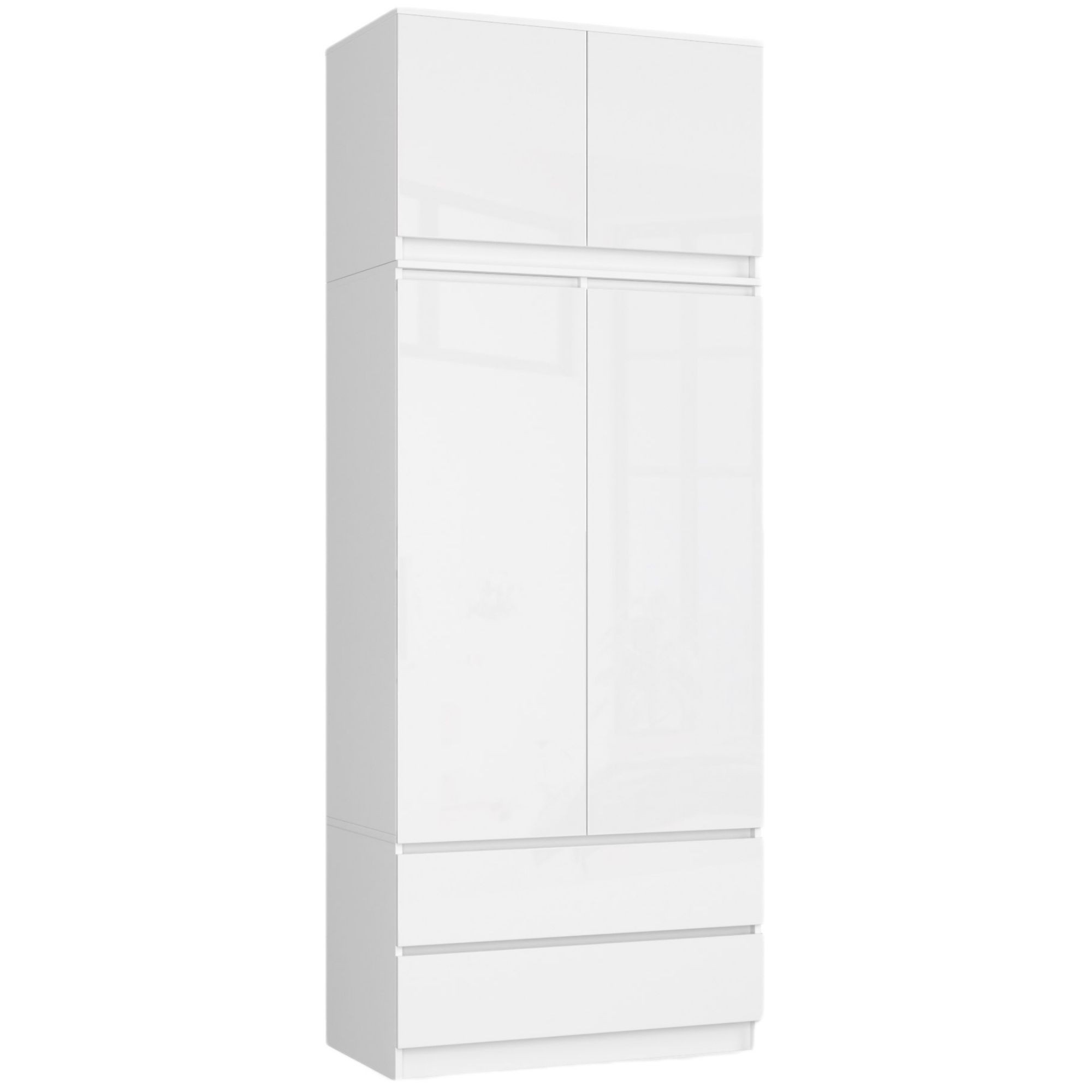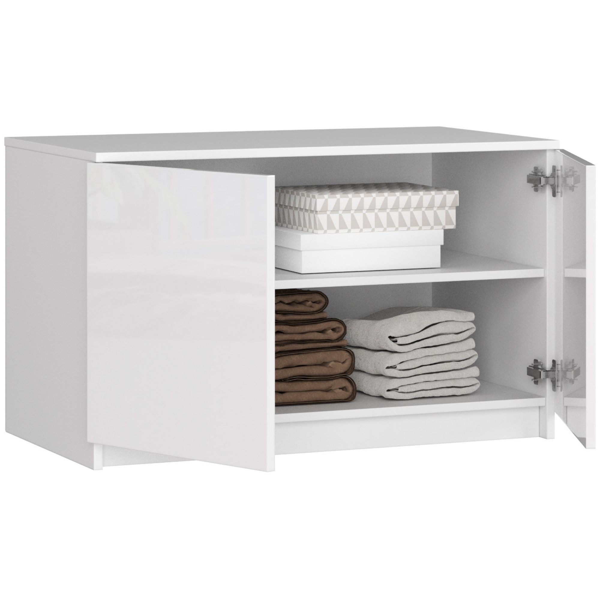 Čistě bílé provedení se snadno kombinuje s jakýmkoli stylem interiéru – moderním, minimalistickým, skandinávským i klasickým. Lesklé čelo zásuvek dodává nástavbě exkluzivní a svěží vzhled. Za dvířky se nacházejí dvě prakticky členěné police, které pomáhají udržet pořádek a uložit věci mimo dohled.