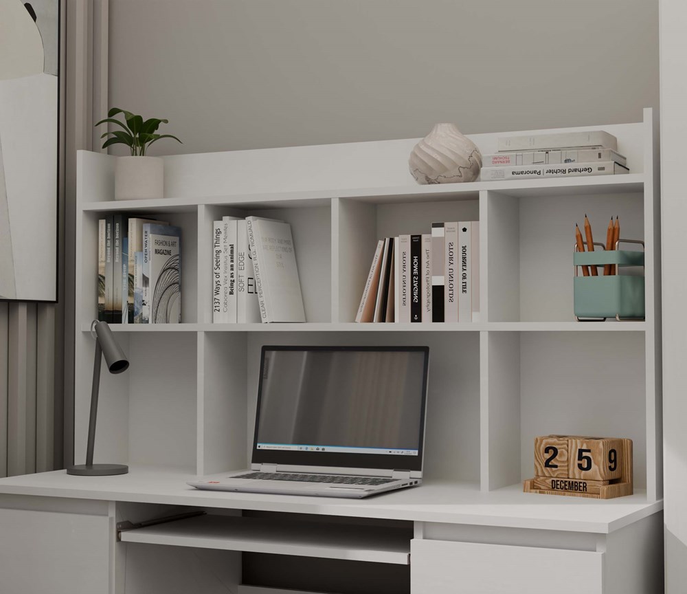 Nástavec na stůl je ideálním řešením pro všechny, kteří si cení pořádku, pohodlí a funkčnosti na svém pracovišti nebo při studiu. Díky promyšlené konstrukci poskytuje dodatečný prostor pro uložení knih, dokumentů, kancelářských potřeb nebo dekorací. Nástavec se připevňuje přímo k pracovní desce stolu. Nástavec 130 cm je určen pro stoly z řady KUBA z naší nabídky.Klasická matná bílá barva nástavce dodává interiéru lehkost a svěžest a skvěle ladí jak s moderními, tak i s klasickými aranžmá.