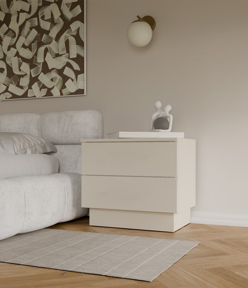Stolek má dvě prostorné, bezúchytkové zásuvky otevírané na klik díky systému tip on, které jsou ideální pro každodenní předměty. Moderní barevné provedení v odstínu kašmíru doplňují černé detaily. Konstrukce z laminované desky je stabilní a vzhledově čistá, díky čemuž je stolek vhodný jako noční nebo pomocný kus nábytku. Výrobek pochází od polského výrobce, což zaručuje solidní zpracování.