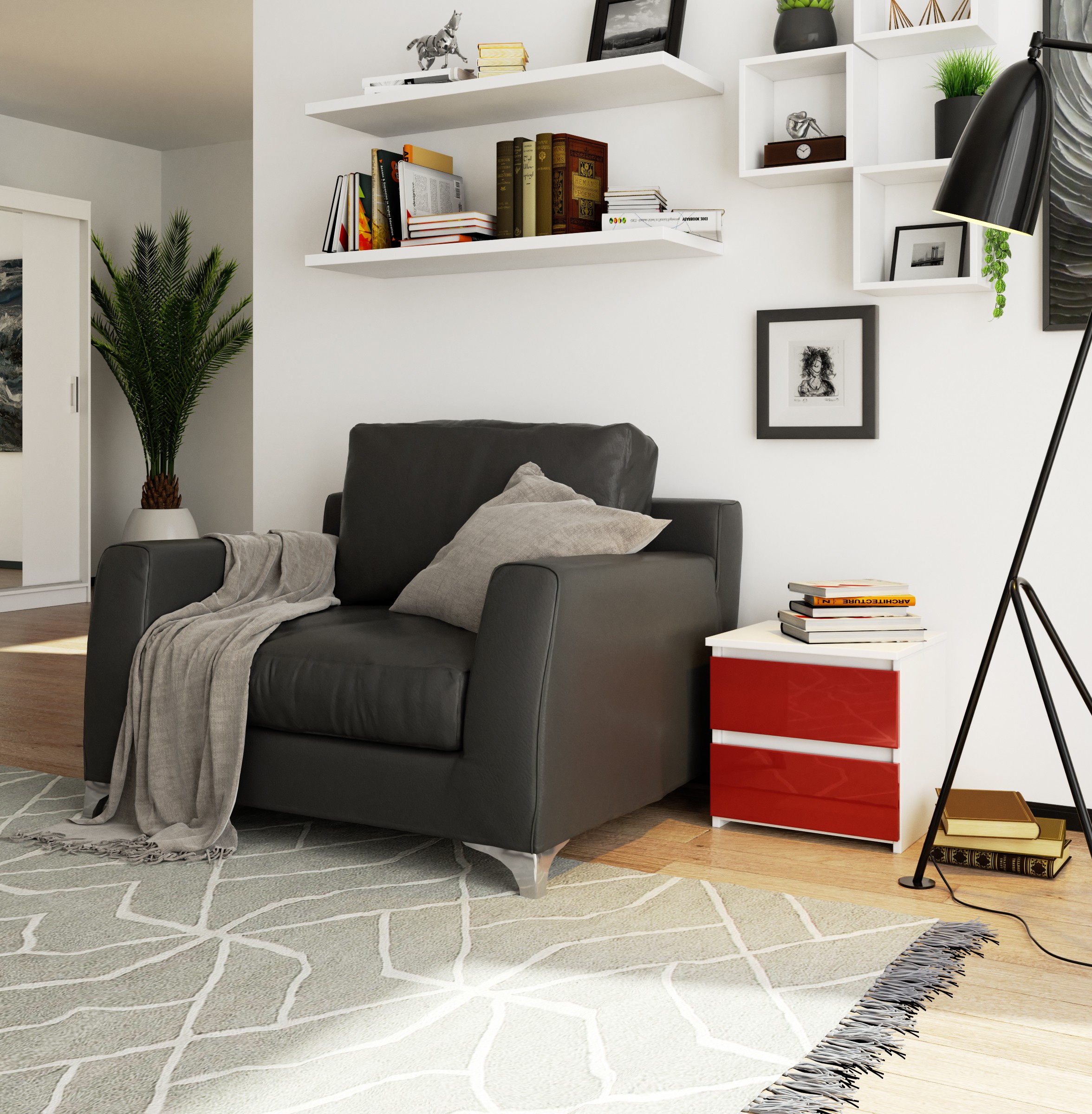 Noční stolek CL2 v bílé barvě s červenými akrylovými lesklými čely je moderní a nepřehlédnutelný doplněk, který oživí každou ložnici, studentský pokoj i hravý interiér. Díky kompaktním rozměrům jej snadno umístíte i do menších prostor, přesto nabízí dostatek praktického úložného místa.