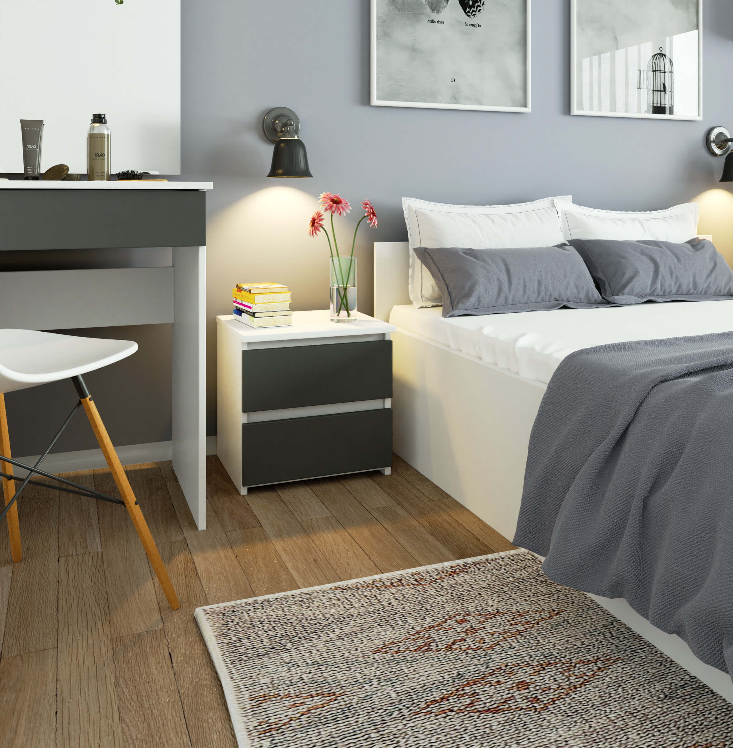 Noční stolek CL2 v kombinaci bílé a grafitově šedé barvy je stylový kousek nábytku, který doplní moderní interiéry i menší místnosti. Díky kompaktním rozměrům se snadno umístí vedle postele a poskytne praktické místo na lampu i osobní věci.