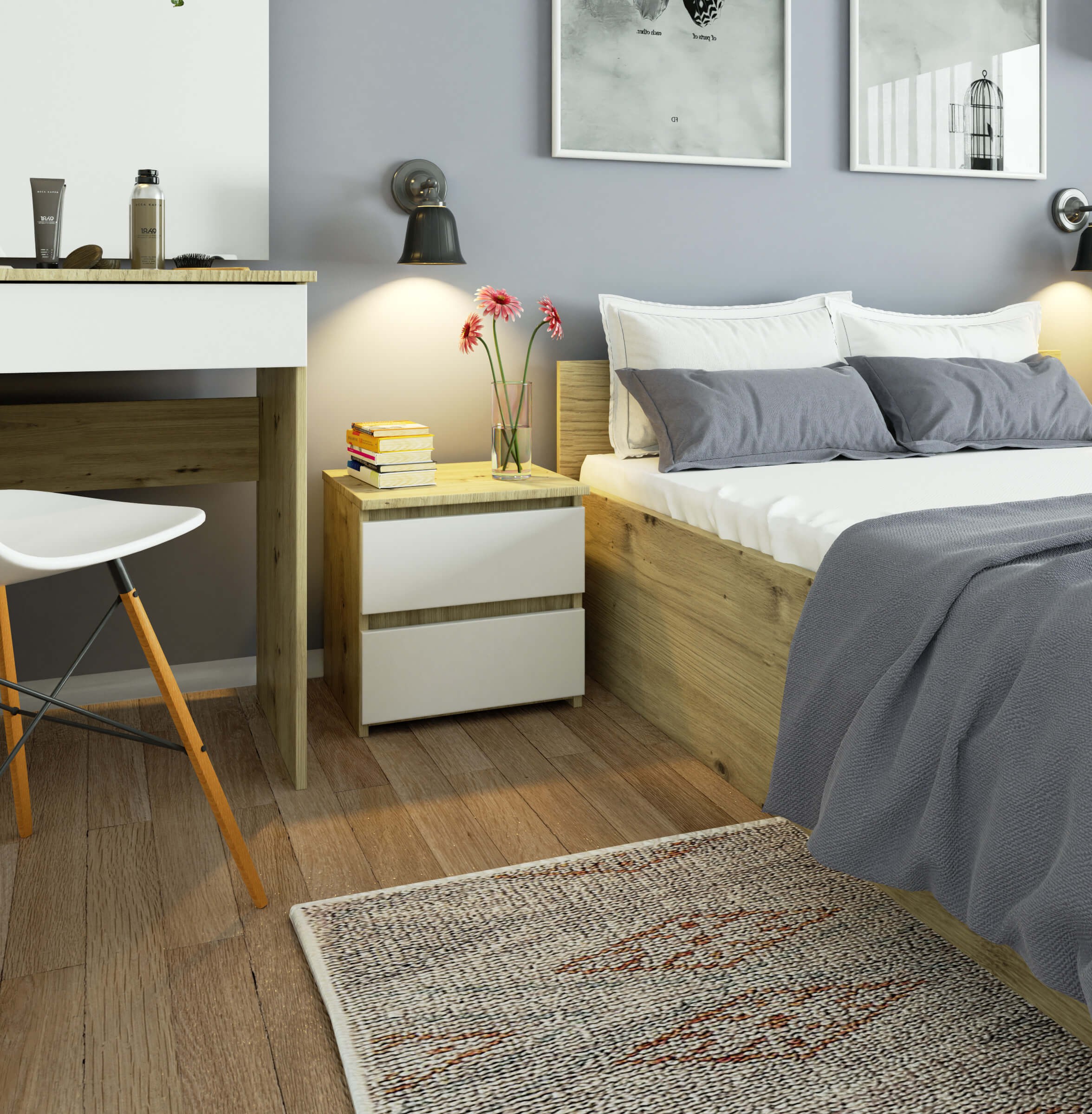 Noční stolek CL2 v dekoru dub artisan s bílými čely zásuvek spojuje moderní vzhled s vysokou praktičností, díky čemuž se skvěle hodí do ložnice, dětského pokoje i studentského prostoru.