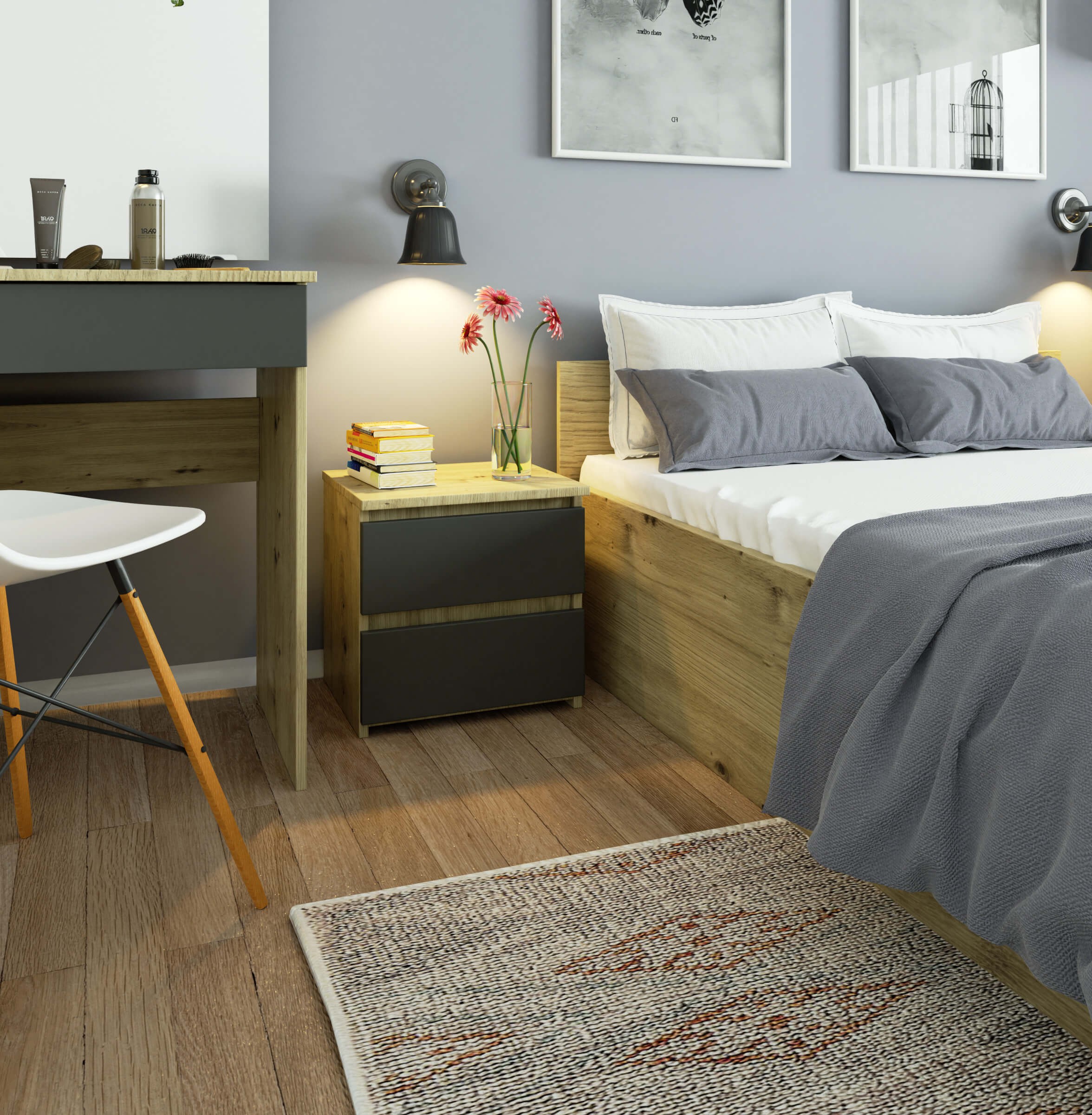 Noční stolek CL2 v dekoru dub artisan s grafitově šedými zásuvkami nabízí elegantní vzhled a praktické využití v každé domácnosti. Umístěný u postele poskytuje rychlý přístup k věcem, které potřebujete při odpočinku a spaní – jako je kniha, telefon, brýle nebo lampička.