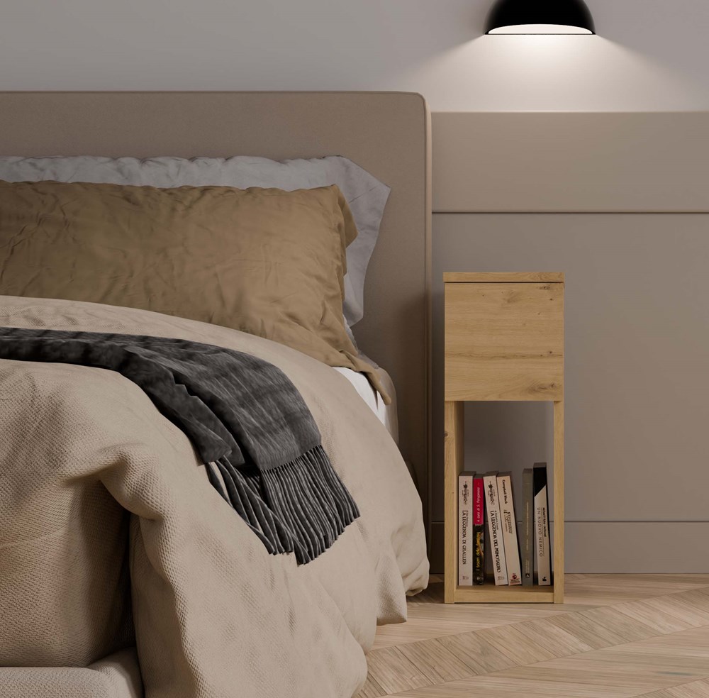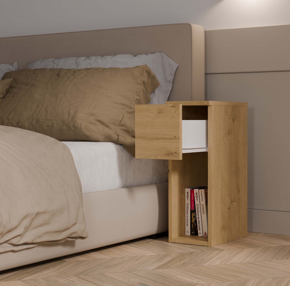 Zásuvka a otevřená police: ideální pro uložení nejnutnějších věcí, jako jsou telefon, nabíječka, kniha či brýle.