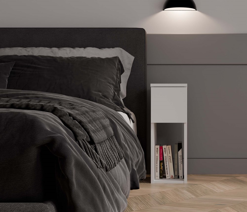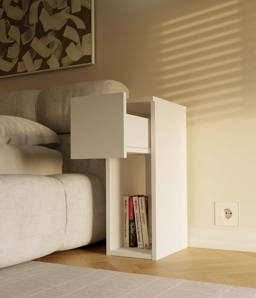 Zásuvka a otevřená police: ideální pro uložení nejnutnějších věcí, jako jsou telefon, nabíječka, kniha či brýle.