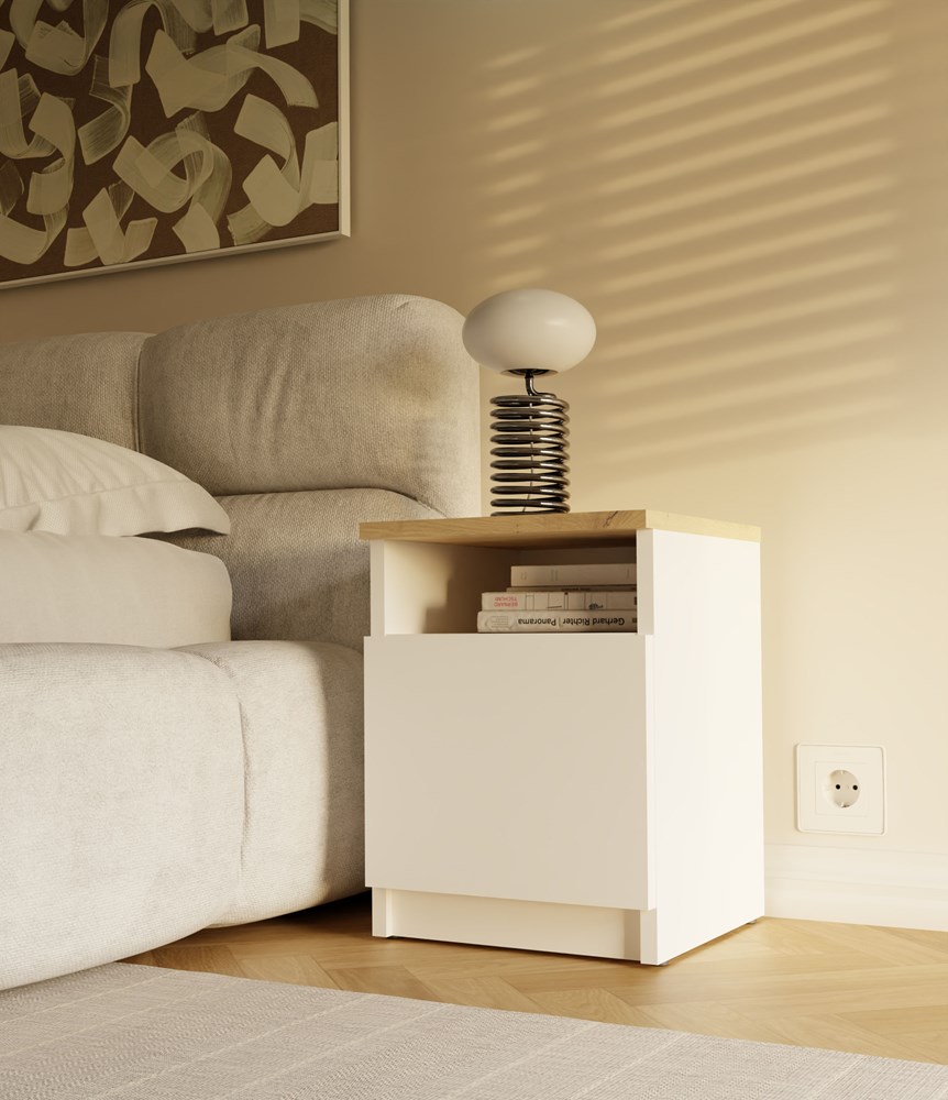 Vrchní deska skříňky je ideální pro noční lampičku, budík nebo dekorativní doplňky. Klasická barva nábytku dodává interiéru svěžest a lehkost a zároveň se hodí jak do moderních, tak tradičních aranžmá.