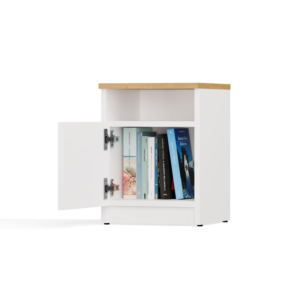 Noční skříňka GALAX 30 1D je praktickým a estetickým doplňkem každé ložnice. Vybavená otevřenou policí a uzavřeným prostorem za dveřmi skvěle poslouží jako místo pro knihu, telefon, nabíječku či jiné drobnosti, které chcete mít vždy po ruce.