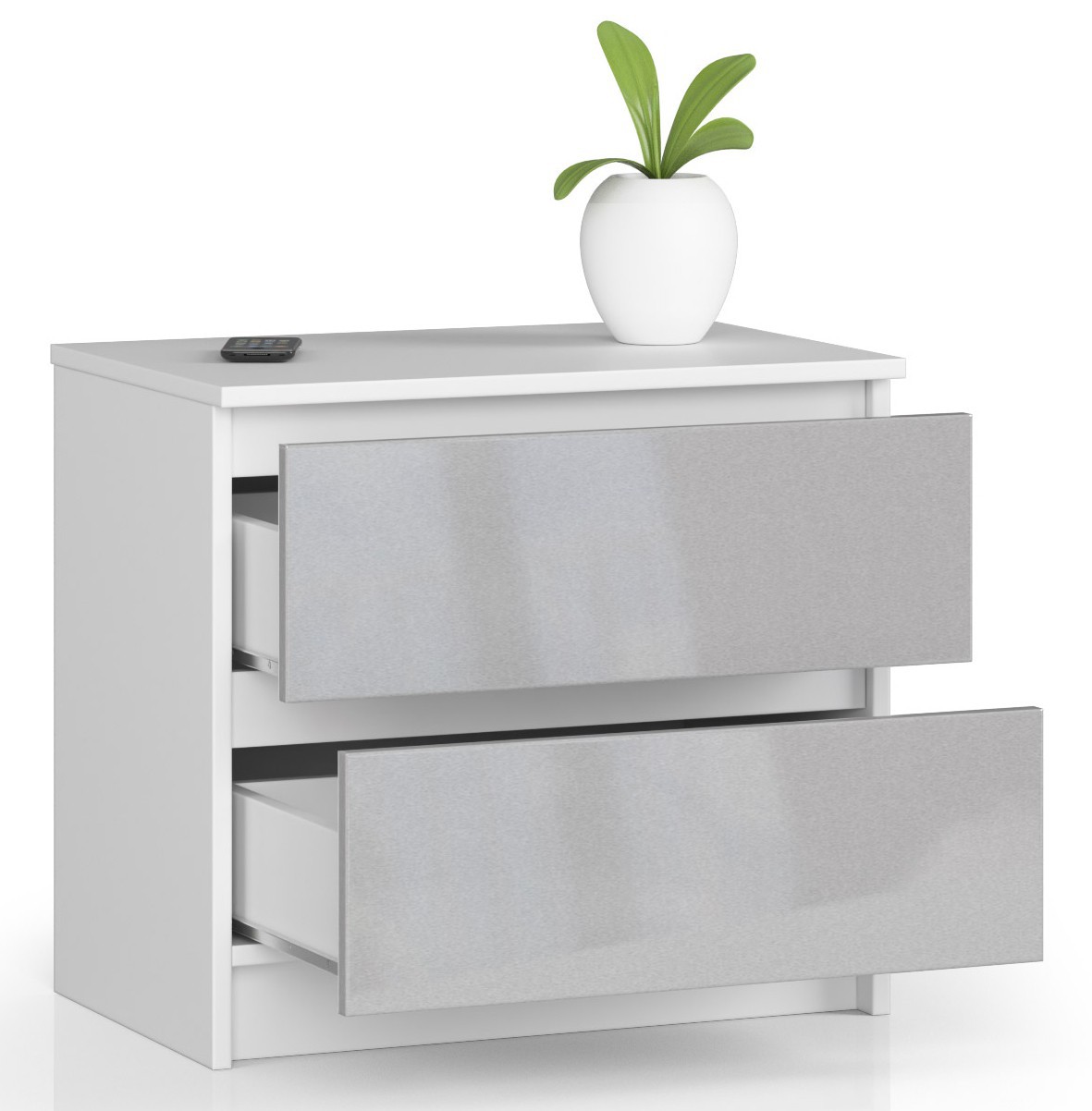 Noční stolek K60 2SZ v bílé barvě s metalickým leskem je moderní a elegantní noční stolek, který krásně doplní ložnici, obývací pokoj i pracovnu. Kombinace bílého matného korpusu a vysoce lesklých metalických čel zásuvek dodává interiéru luxusní a svěží vzhled.