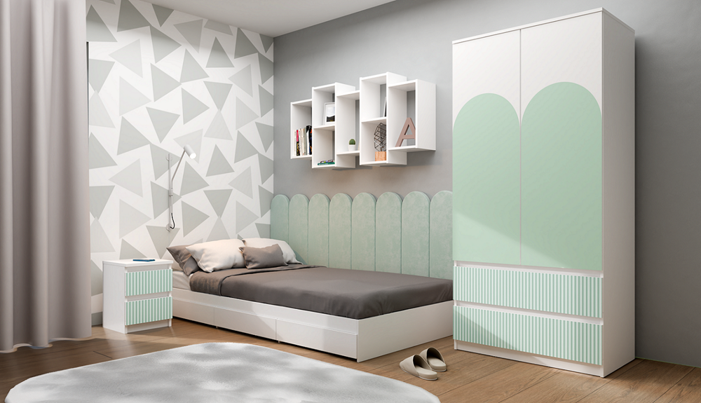 Moderní bezúchytová čela zásuvek s vertikálními mátovými vzory vytištěnými moderní technologií zajišťují pohodlné používání a podtrhují modernistický charakter interiéru. Ideální do dětského nebo studentského pokoje.