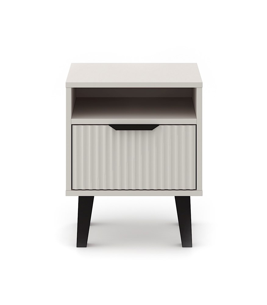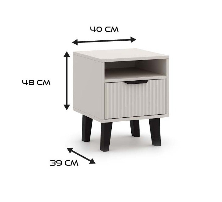 Stolek je vybaven jednou prostornou zásuvkou a praktickou otevřenou policí, což umožňuje udržet pořádek v nezbytných předmětech – od knih a nabíječek až po kosmetiku či brýle. Ryhované čelo dodává celku charakter a jemnou eleganci, podtrhující lehkost a styl inspirovaný skandinávskými trendy.