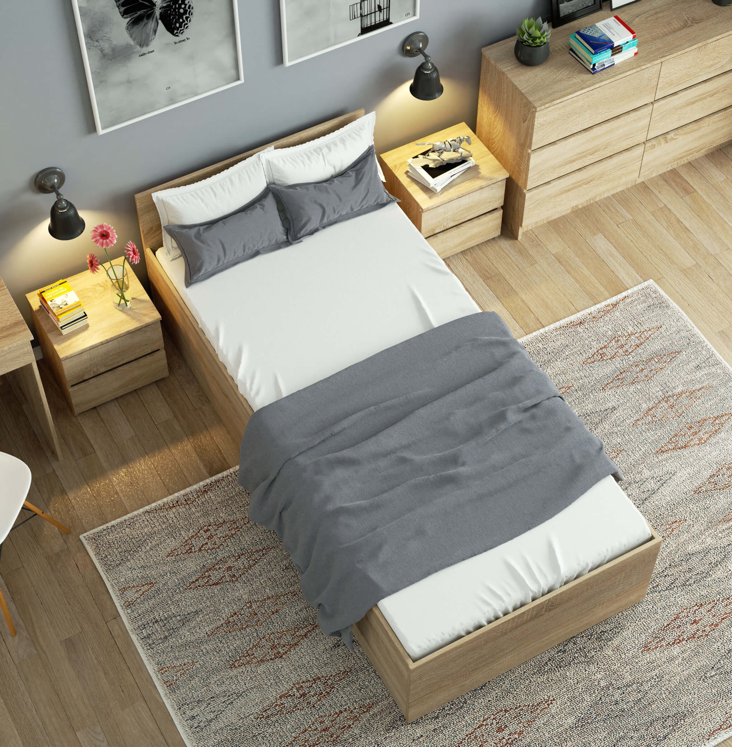 Konstrukce lůžka je vyrobena z laminované desky doplněné ABS hranami. Povrch je odolný proti běžnému opotřebení a snadno se udržuje v čistotě – postačí vlhký hadřík a jemný čisticí prostředek. Dekor dřevěný dub sonoma dodává lůžku přírodní vzhled a vytváří útulnou atmosféru v interiéru.