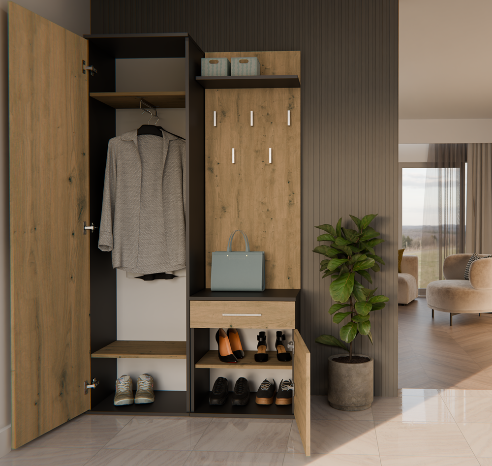 Předsíňová sestava DUO je ideální volbou pro ty, kteří chtějí mít doma krásný a praktický nábytek. Sestava zahrnuje prostornou skříň s velkým zrcadlem, věšák s policí a menší skříňku se šuplíkem v elegantní kombinaci antracitové a odstínu dřeva Artisan. Moderní design uspokojí každého, kdo ocení spojení jednoduchosti a elegance. Skříň s lustrem nabízí dostatek úložného prostoru, menší skříňka a šuplík poslouží pro drobnosti a věci každodenní potřeby. Věšák je vybaven pěti háčky a policí. Jednotlivé části sestavy lze umístit těsně u sebe nebo je volně rozestavit podle potřeby. Dveře skříně lze namontovat na levou či pravou stranu. Skříň s lustrem je rovněž k dispozici k zakoupení samostatně.